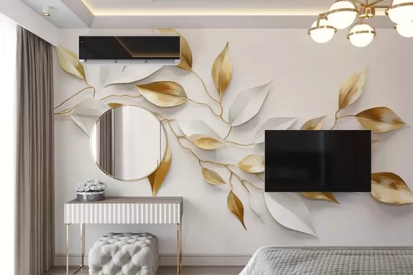 Valokuvatapetti Keltaisia ja valkoisia lehtiä oksalla , tyylikäs muotoilu, valkoinen tausta, minimalistinen tyyli, koristeellinen taide, luonnon inspiroima Nr w09015