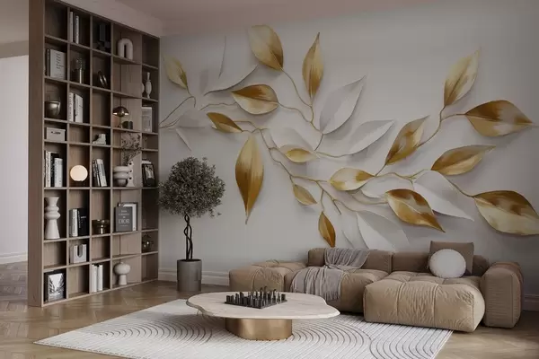 Valokuvatapetti Keltaisia ja valkoisia lehtiä oksalla , tyylikäs muotoilu, valkoinen tausta, minimalistinen tyyli, koristeellinen taide, luonnon inspiroima Nr w09015