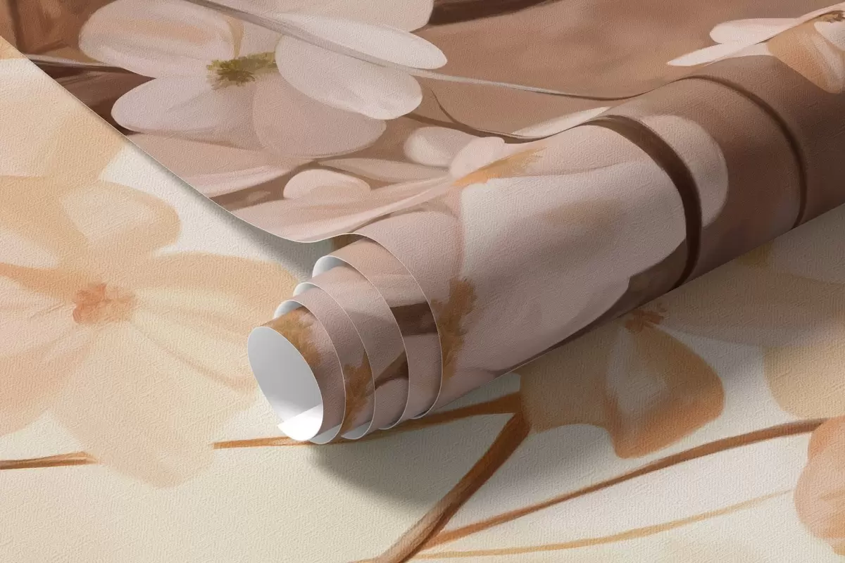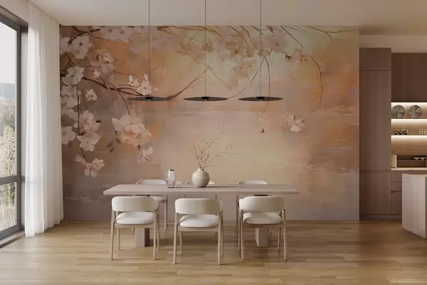 Valokuvatapetti Abstrakti maisema taidetta kukka oksa ja valkoisia kukkia roikkuu yli järven, pehmeät pastellivärit Nr w09046