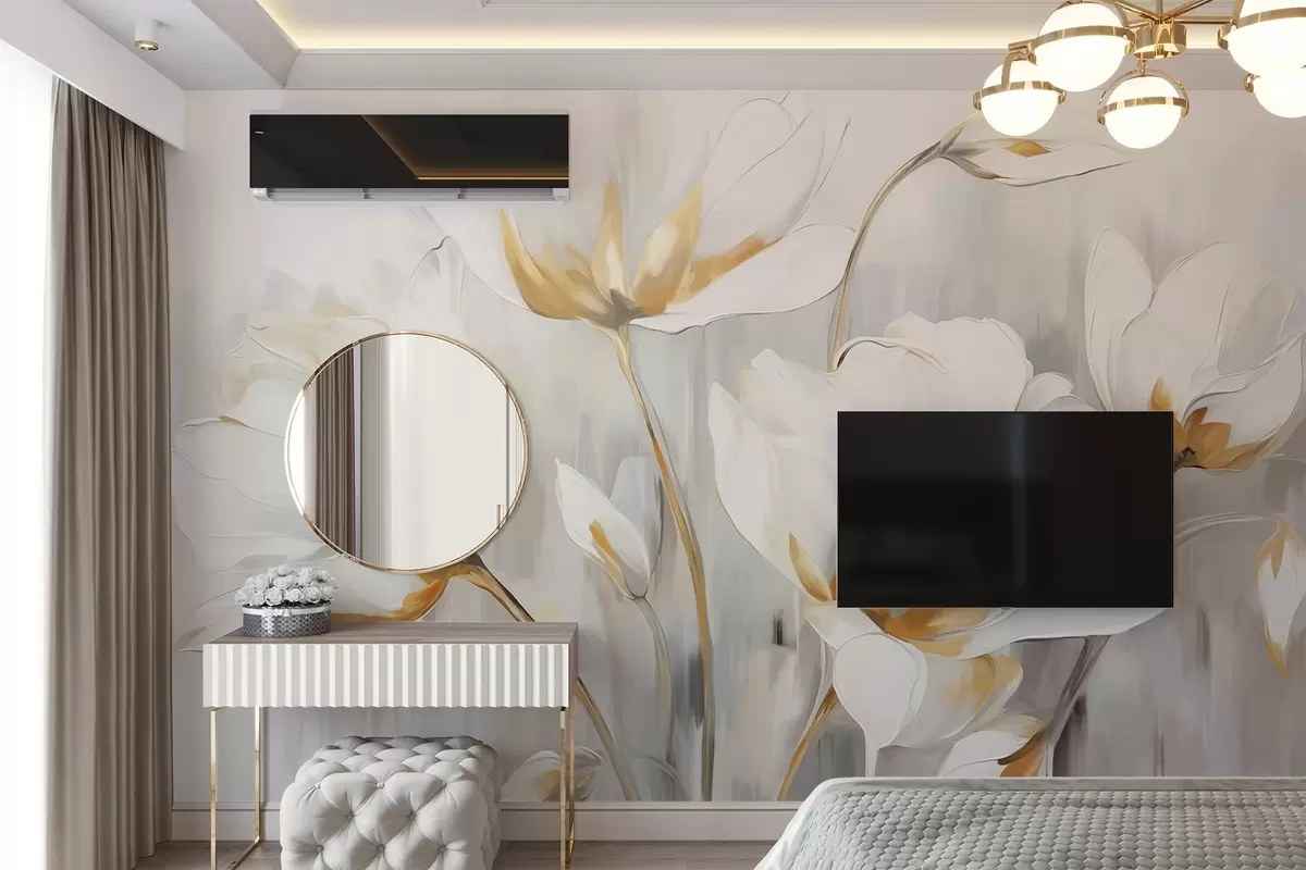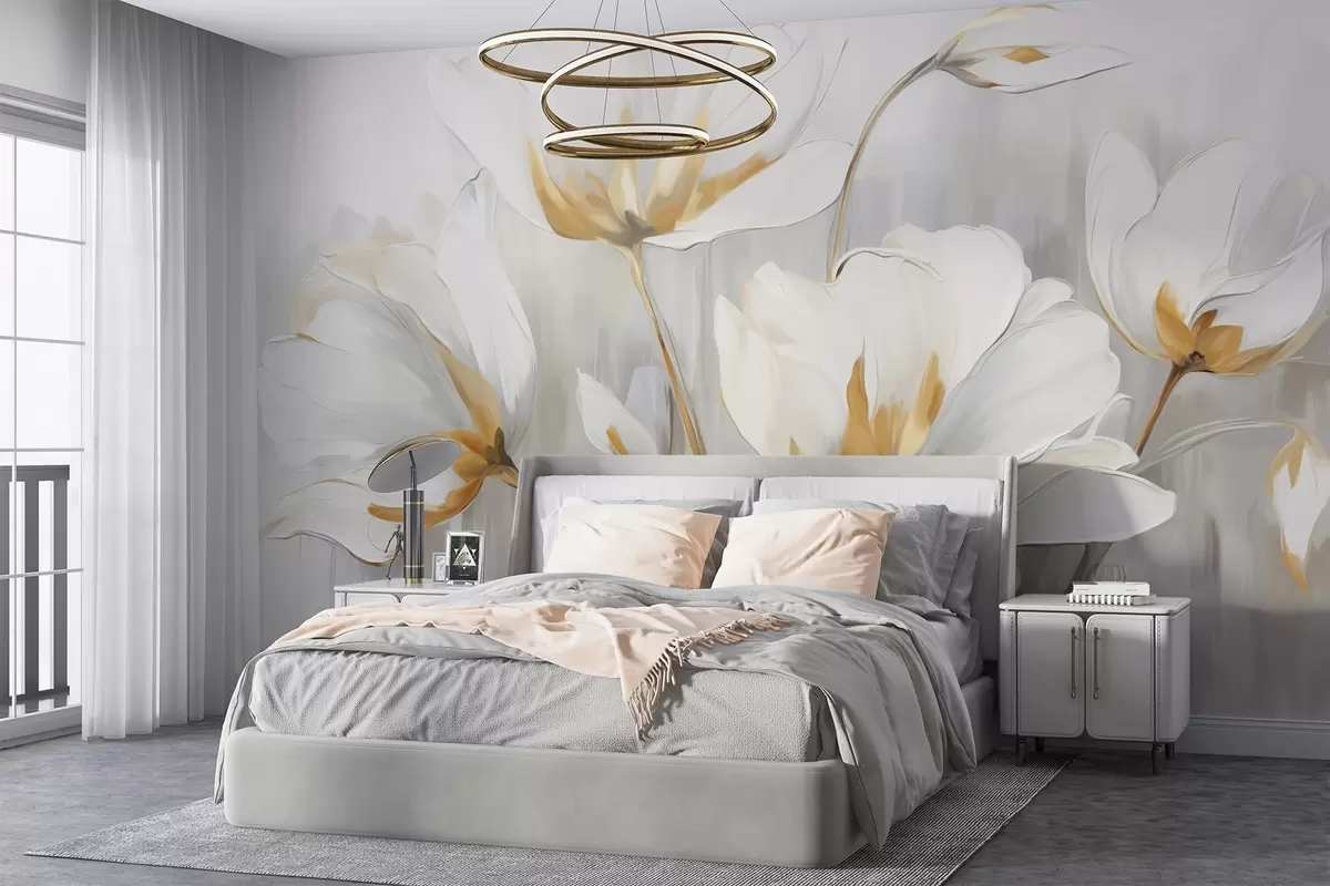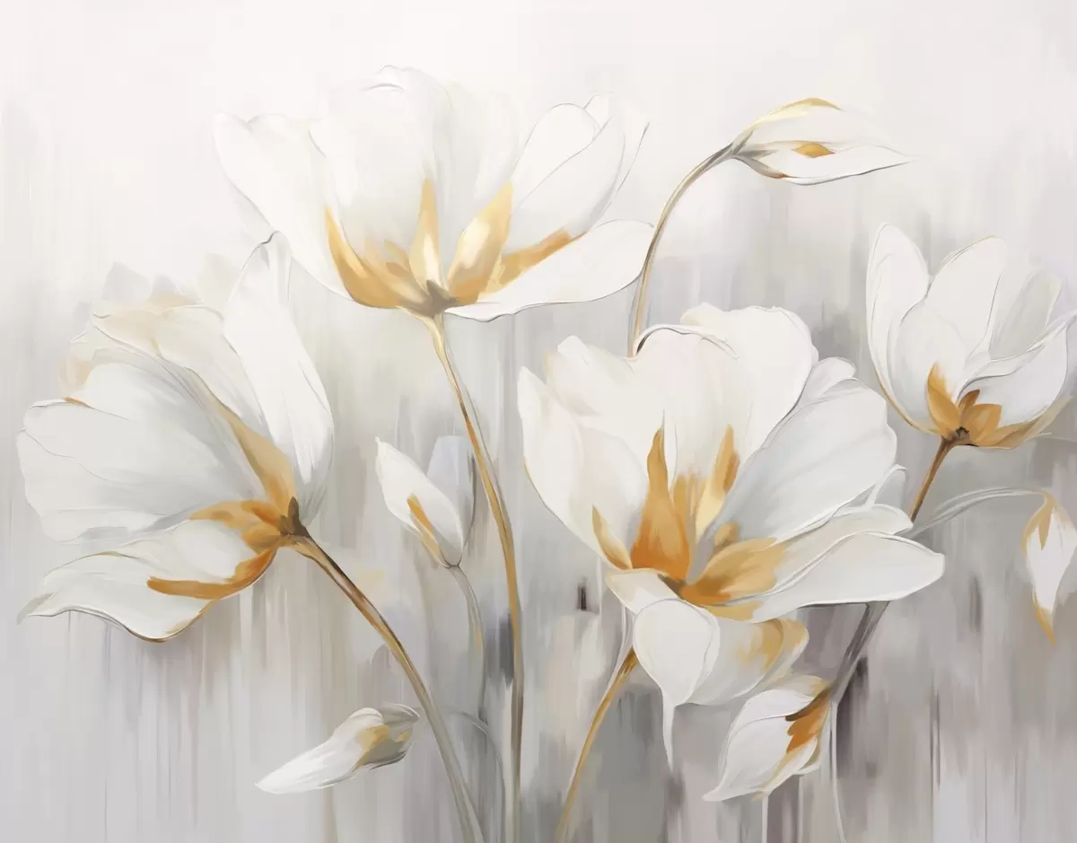 Valokuvatapetti Valkoisia abstrakteja kukkia, joissa on valkoiset terälehdet ja varret harmaalla pohjalla, jossa on harmaita ja valkoisia pystysuoria siveltimenvetoja Nr w09047