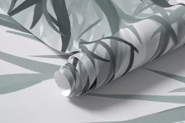 Valokuvatapetti Bambulehdet roikkuvat järven yllä, taustalla vuoret, pehmeät siniset ja valkoiset sävyt, tussimaalaustyylinen maalaus Nr w09048
