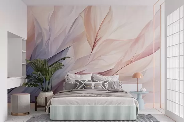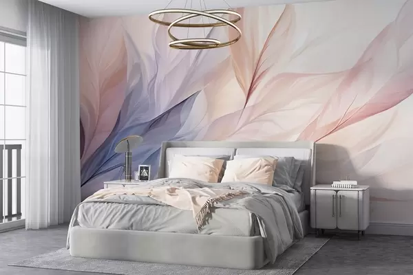 Valokuvatapetti Abstrakti kukka suunnittelu virtaa terälehdet pastelli sävyjä vaaleanpunainen, persikka, ja sininen, luoden pehmeä ja unenomainen koostumuksen Nr w09049