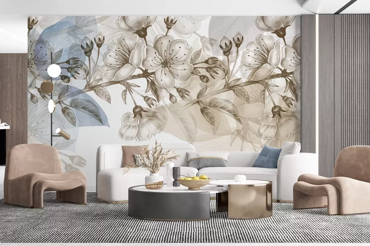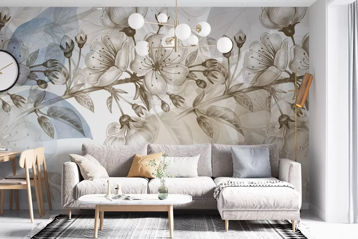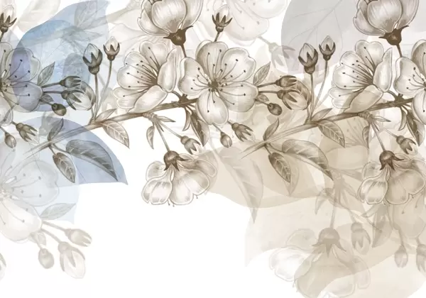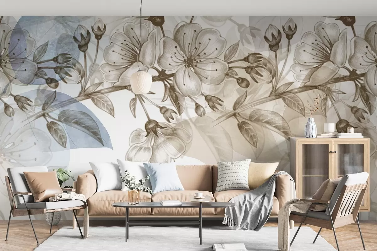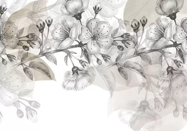 Valokuvatapetti Kirsikankukkien oksa, kukkia ja nuppuja, seepian sävyjä, pehmeä akvarellimainen tausta, jossa on sinisen ja ruskean sävyjä Nr w09051