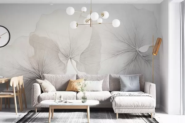 Valokuvatapetti Kolme läpikuultavaa lehteä, joissa on näkyvät suonet, kohinatekstiili, hieman päällekkäin, ohuet varret valkoisella pohjalla Nr w09052