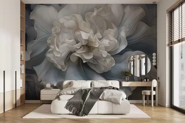 Valokuvatapetti Abstrakti suuri koristeellinen kukka, jossa on monia terälehdet, pehmeä ja herkkä, sininen ja harmaa sävyjä taustalla Nr w09055