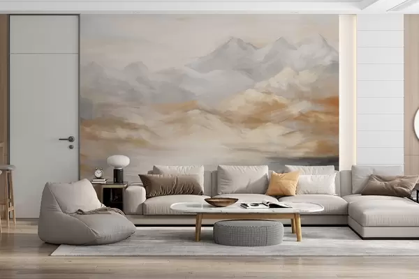 Valokuvatapetti Teksturoitu maisemamaalaus vuorista, joiden etualalla on järvi, valkoisen, harmaan ja ruskean sävyissä w09057