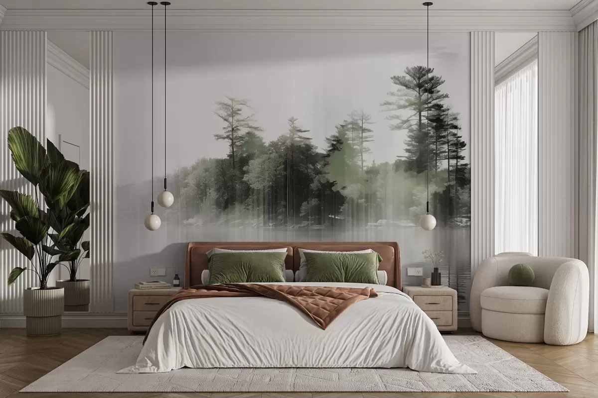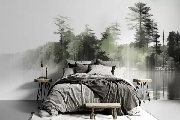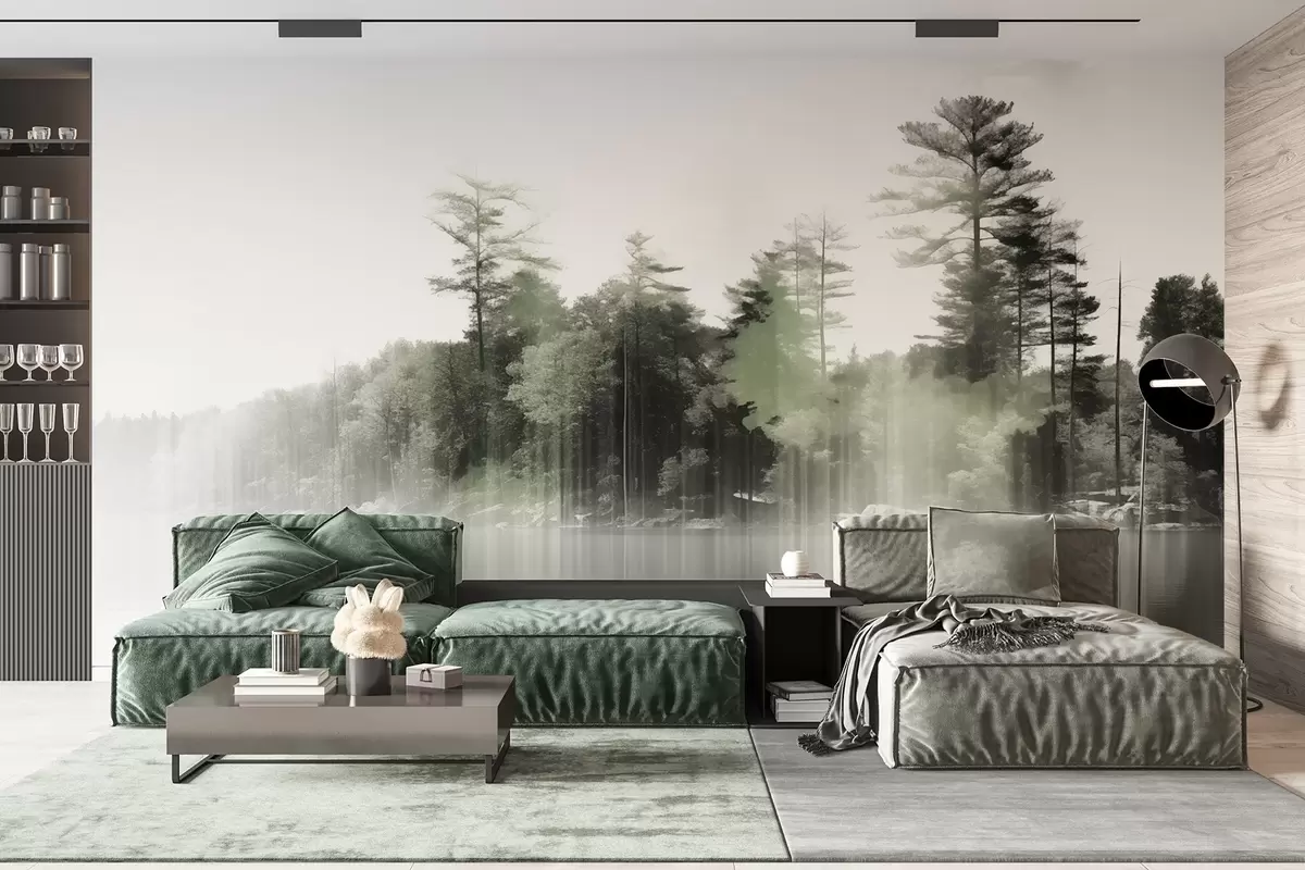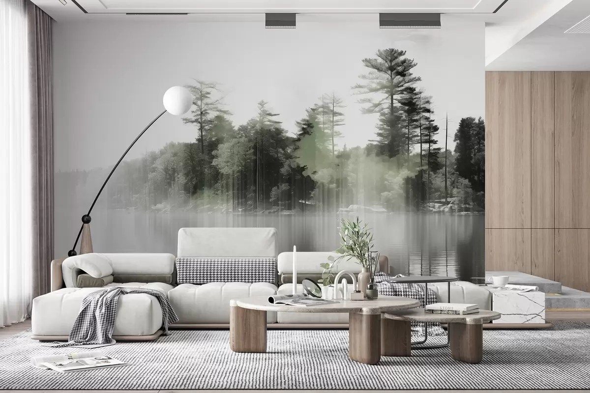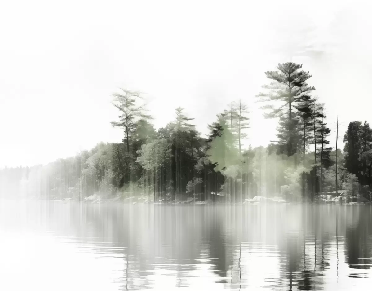 Valokuvatapetti Abstrakti minimalismi kuvioitu maisema, jossa järvi ja puut heijastuksia vedessä vihreän ja valkoisen sävyjä Nr w09058