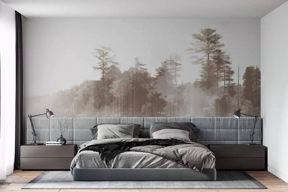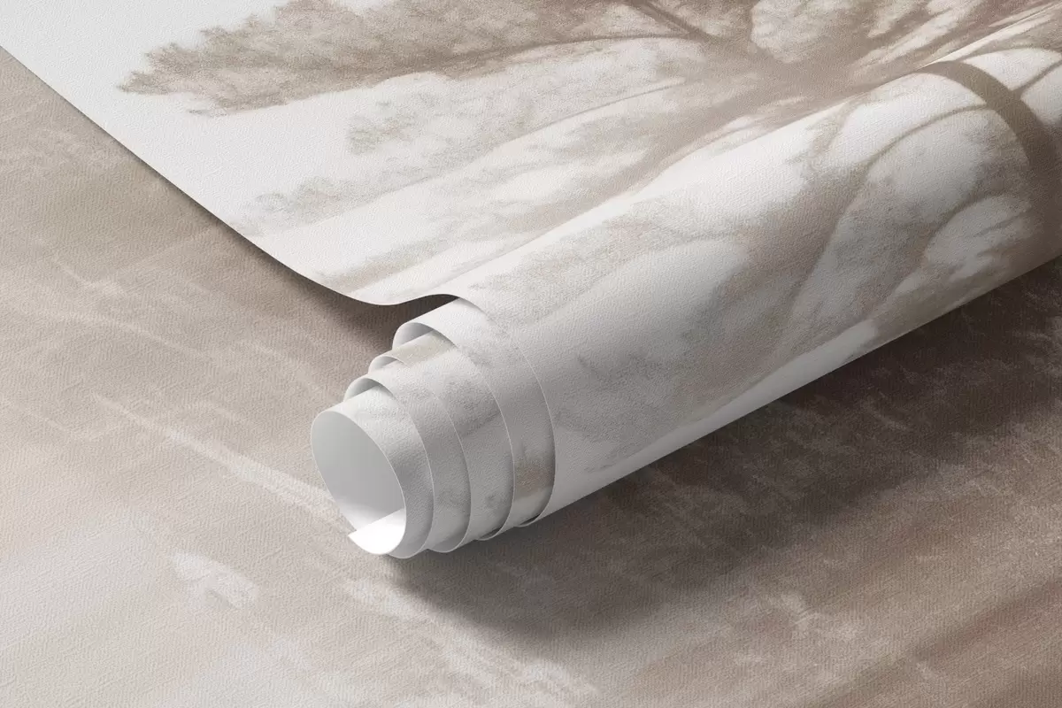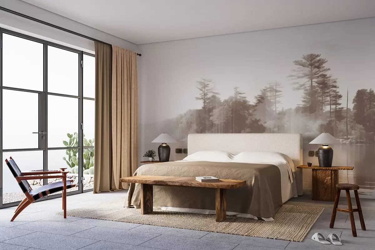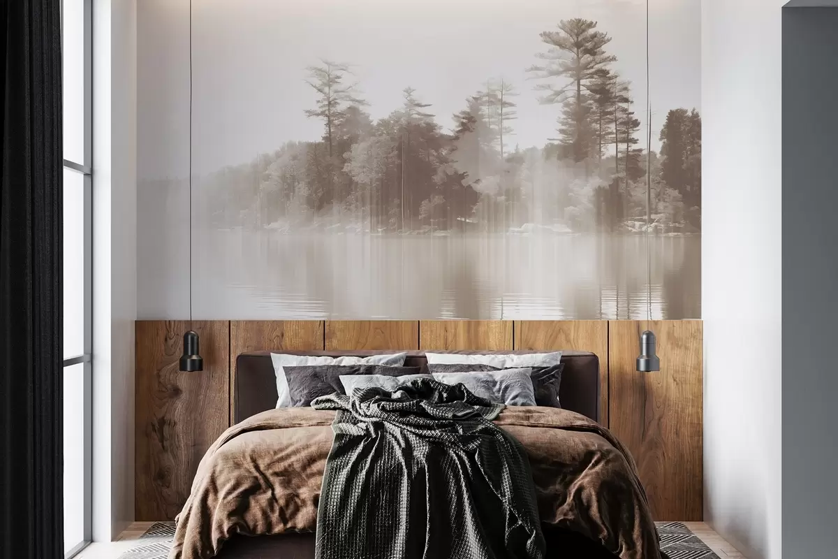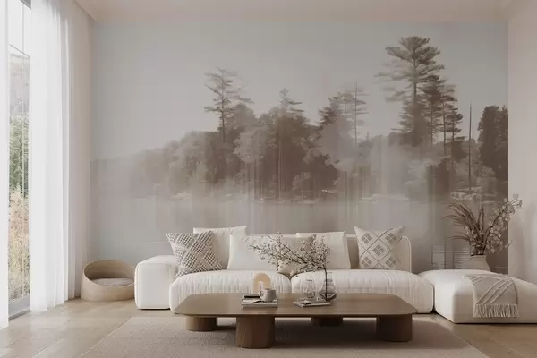 Valokuvatapetti Abstrakti minimalismi kuvioitu maisema, jossa järvi ja puut heijastuksia vedessä beige ja valkoinen sävyjä Nr w09058v1