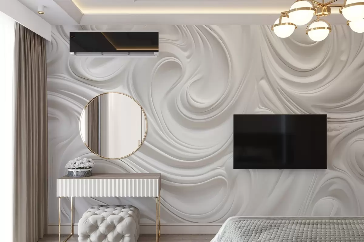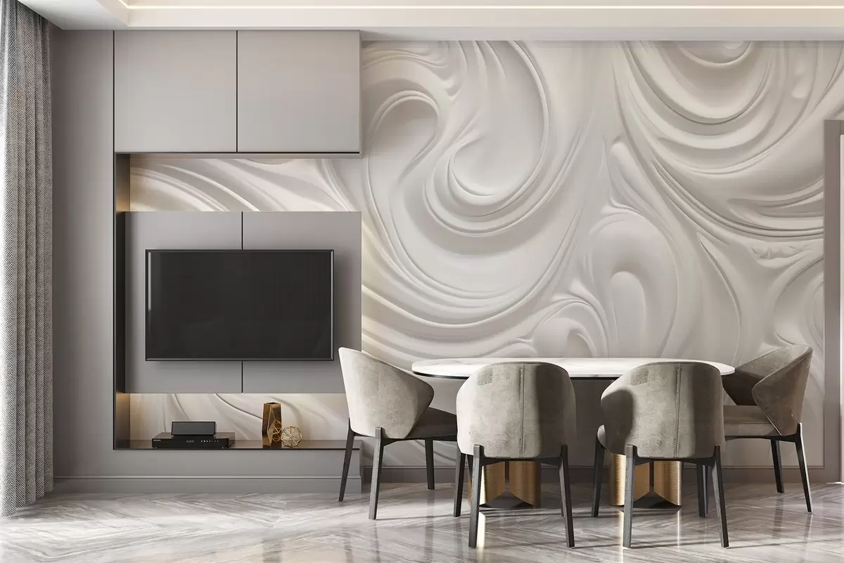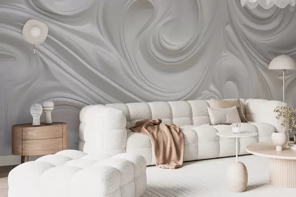 Valokuvatapetti Valkoinen abstrakti moderni taide, jossa on nestemäisiä pyörteitä ja aaltoja, sileä rakenne, tyylikäs muotoilu, minimalistinen estetiikka Nr w09059