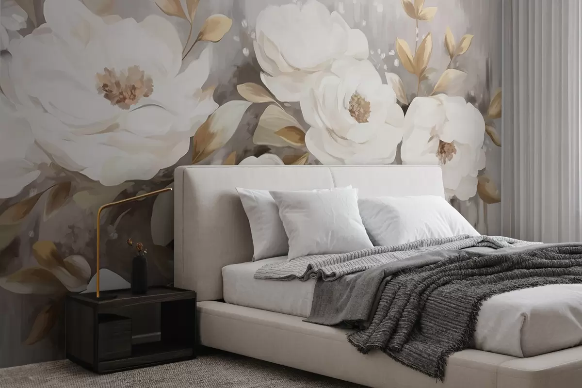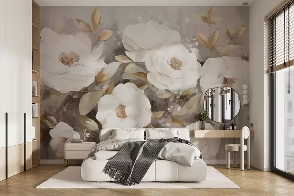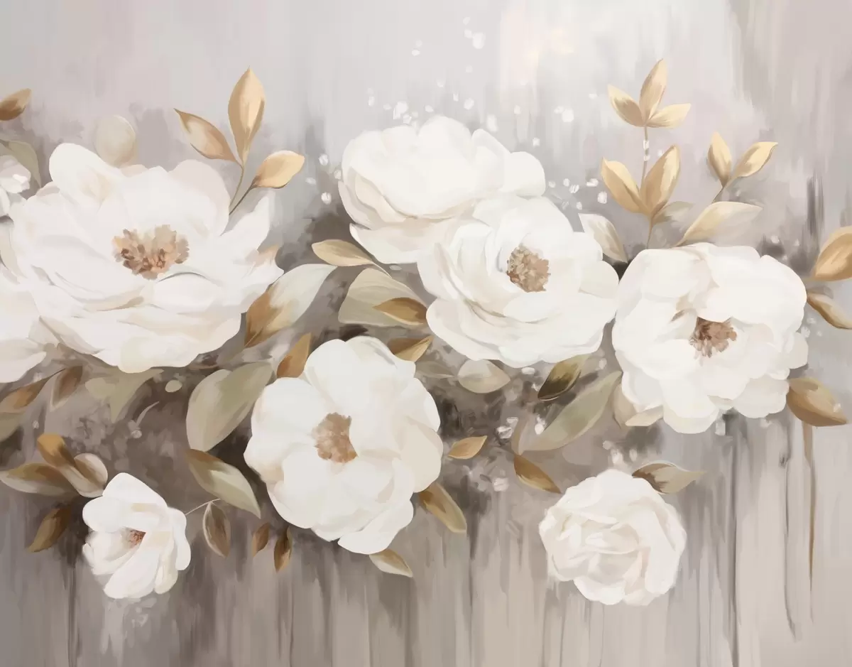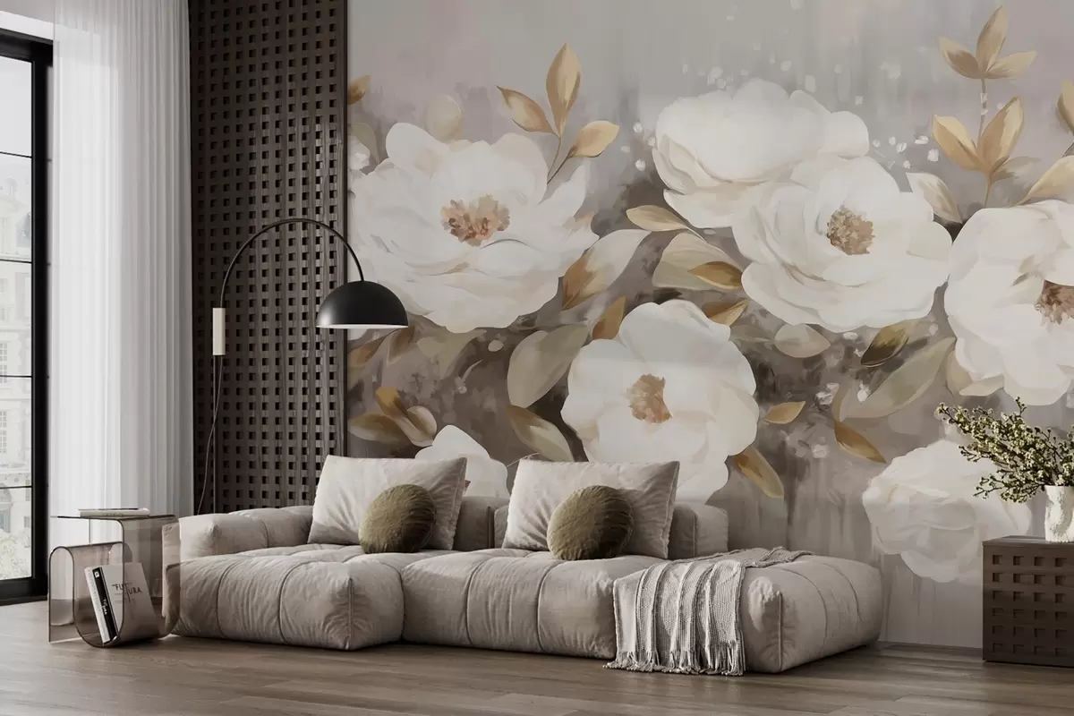 Valokuvatapetti Valkoiset kukat keltaisilla lehdillä, pehmeät terälehdet, herkkä kukka-asetelma, neutraali väripaletti, kuvioidut siveltimenvedot Nr w09062