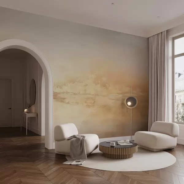 Valokuvatapetti Abstrakti kuvioitu maisema, jossa on lämpimät värit, pehmeä ja unenomainen tunnelma sekä oranssin, keltaisen ja valkoisen sävyjen sekoitus Nr w09063