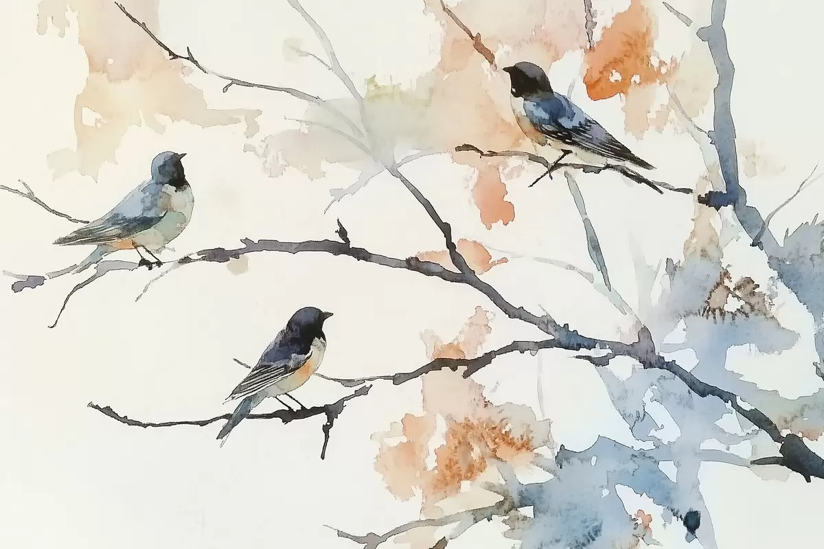 Valokuvatapetti Lintuja puun oksilla akvarellityyliin Nr w09064