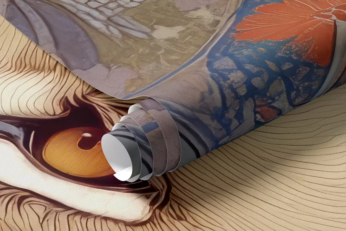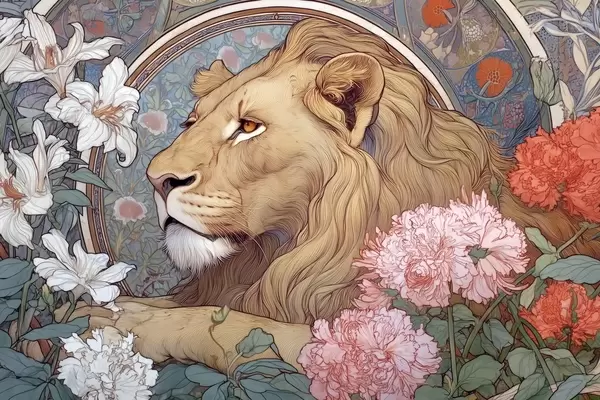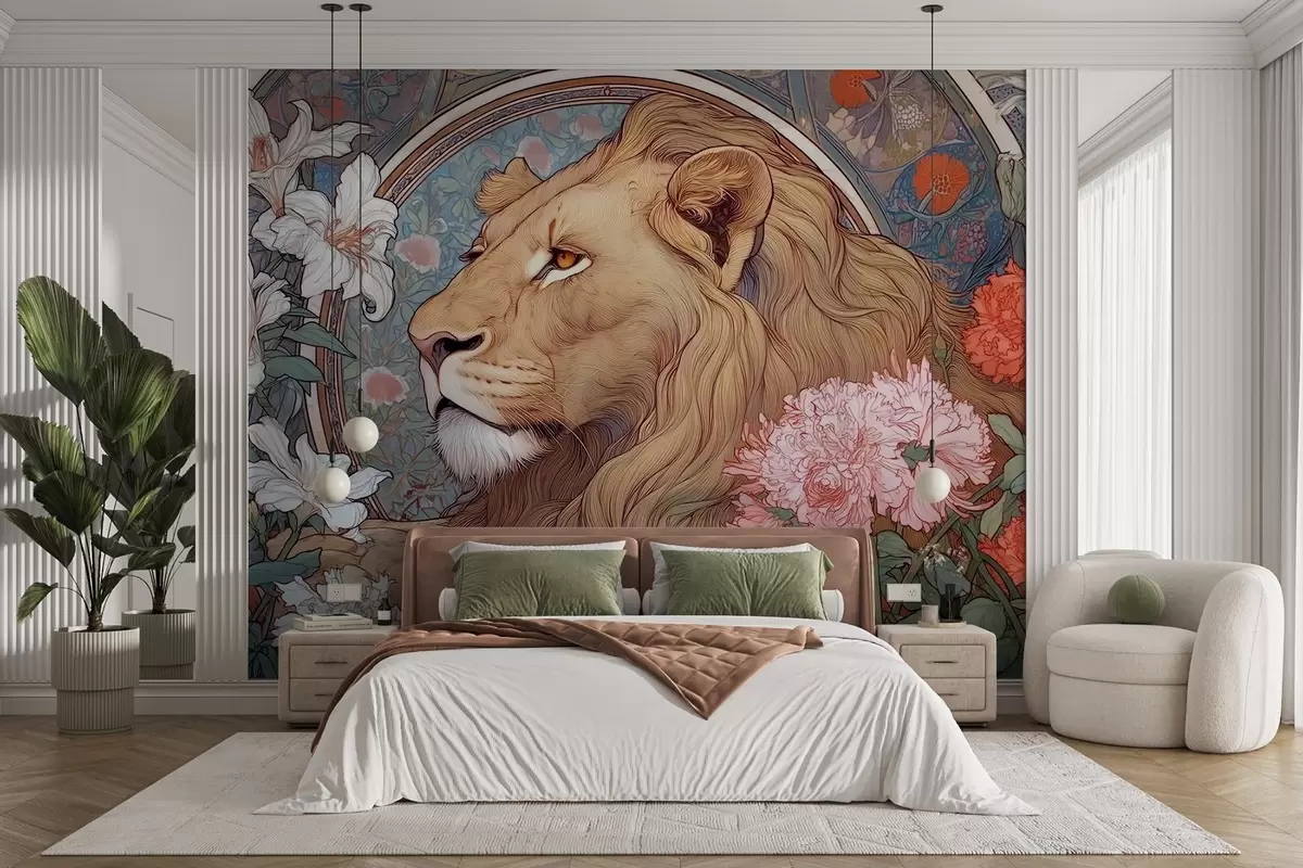 Valokuvatapetti Alphonse Muchan tyyliin maalattu leijona, jota ympäröivät monet kukat Nr w09073