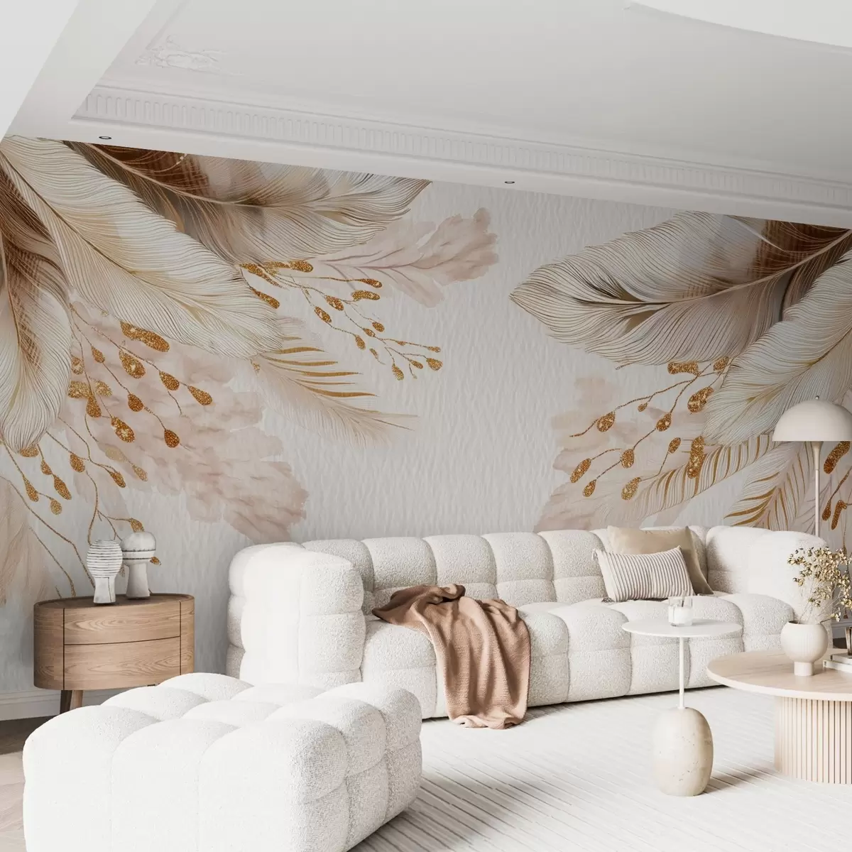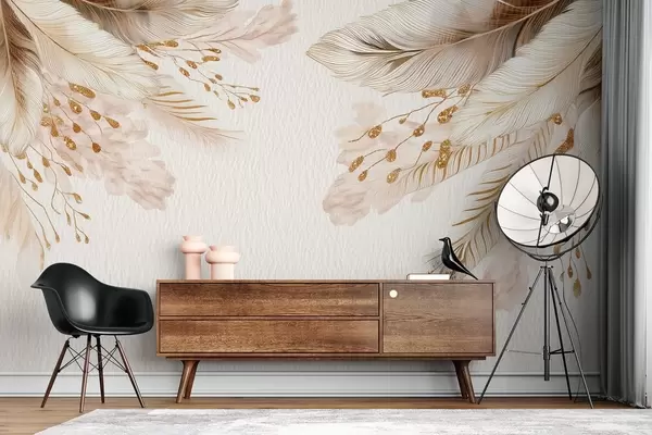 Valokuvatapetti Pampasruohoa ja höyheniä akvarellityyliin beige ja valkoinen paperille Nr w09079