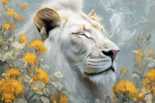 Valokuvatapetti Valkoinen leijona keltaisten kukkien ja savun ympäröimänä Nr w09080