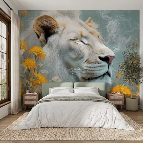 Valokuvatapetti Valkoinen leijona keltaisten kukkien ja savun ympäröimänä Nr w09080