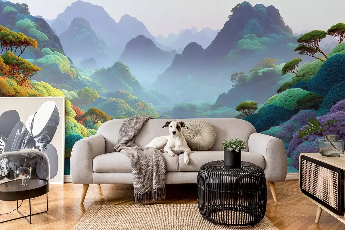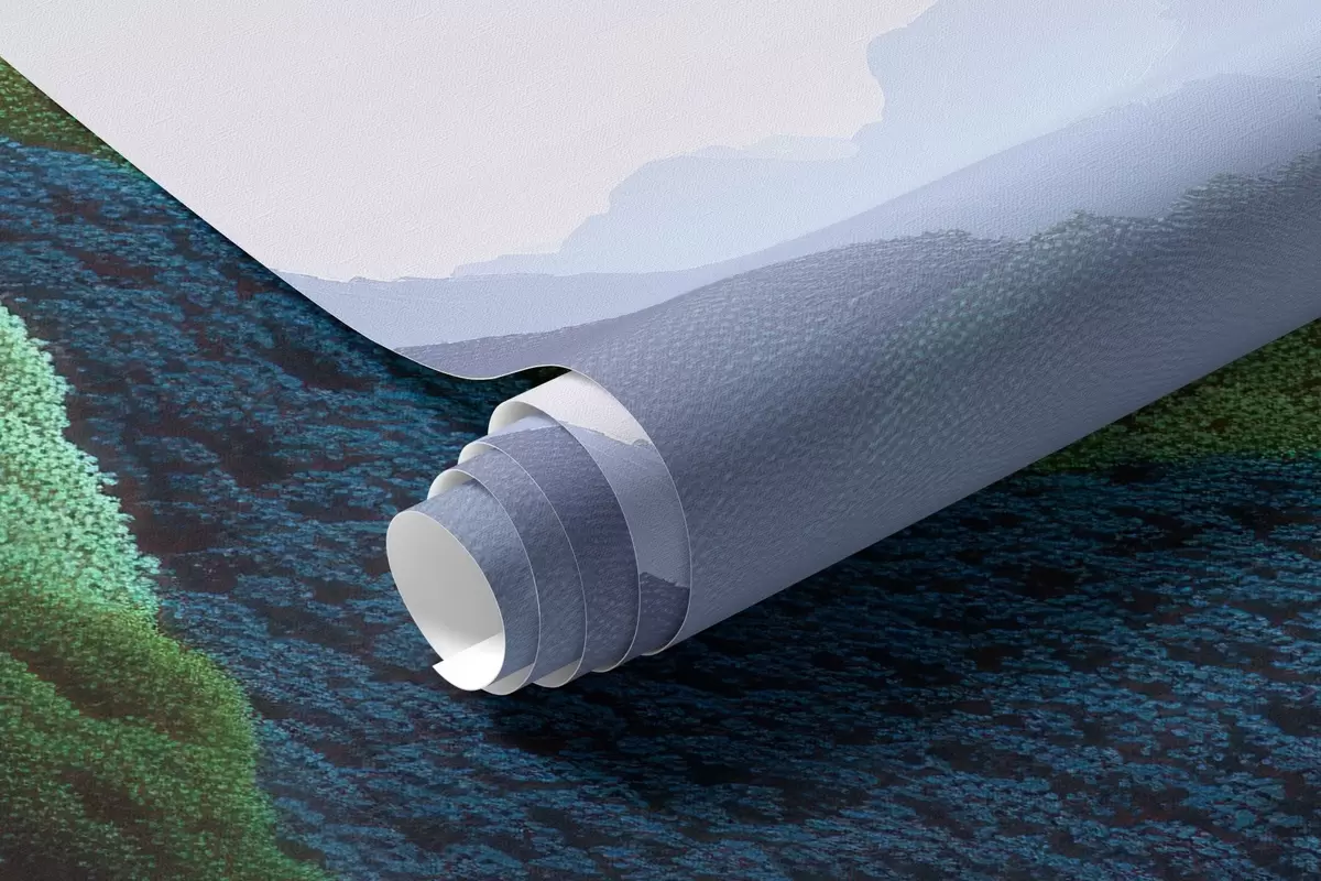 Valokuvatapetti Vuoristomaisema, jossa on joki sinisin sävyin, puita ja pensaita Nr w09088