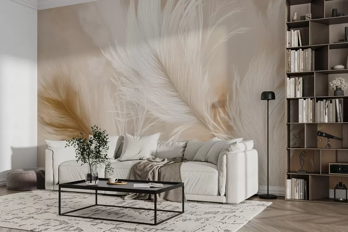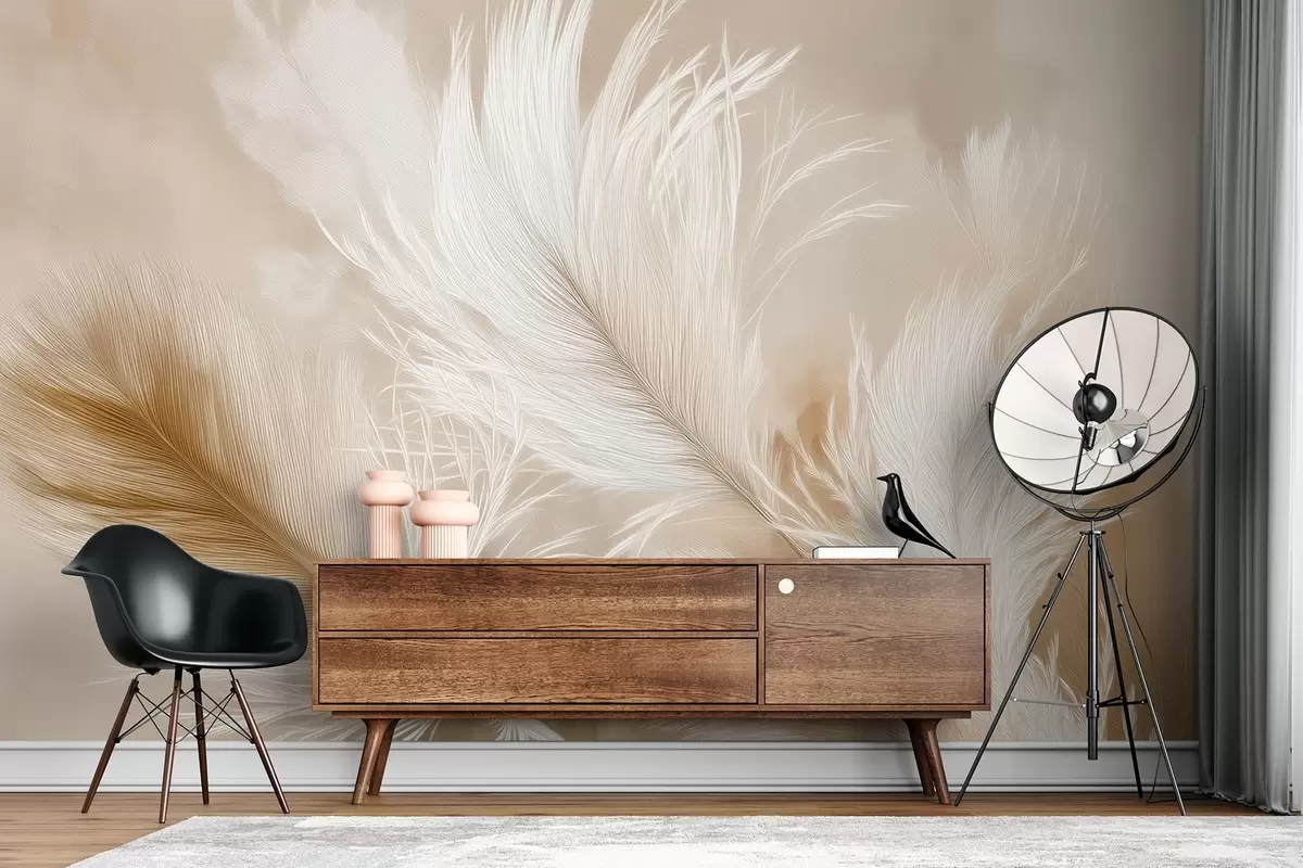 Valokuvatapetti Lentävät ilmavat höyhenet beigellä taustalla w09102