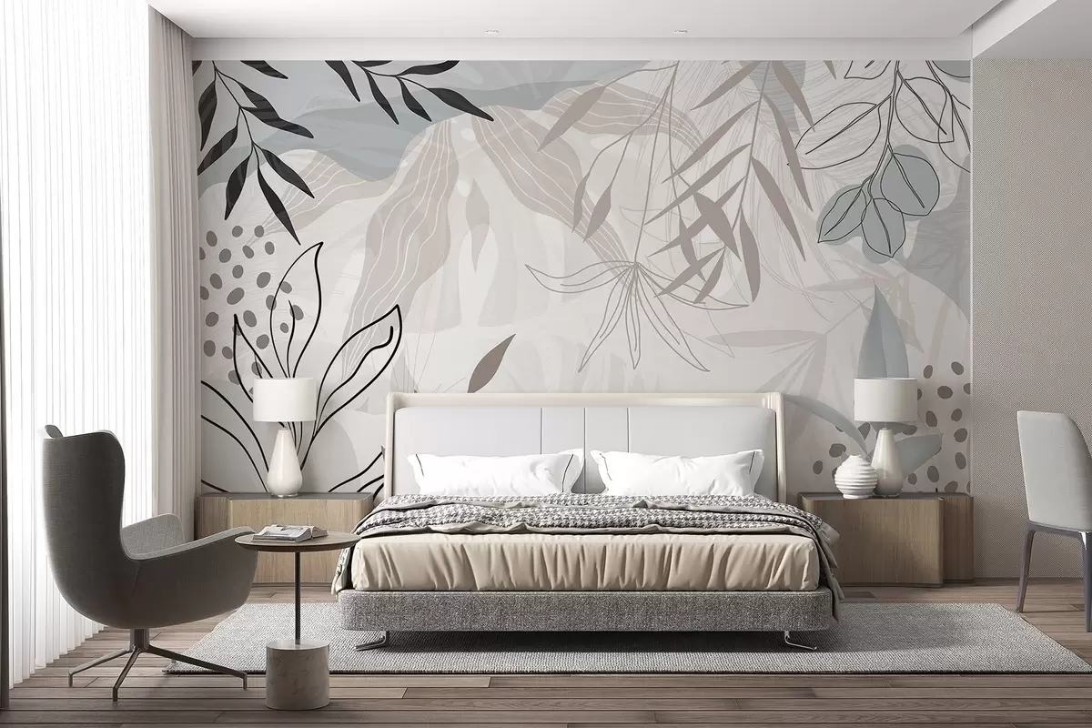 Valokuvatapetti Abstrakti kukka moderni muotoilu pastelli beige, harmaa, sininen ja musta lehdet, herkkä viivataide ja pehmeä tausta Nr w09105