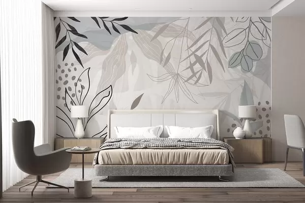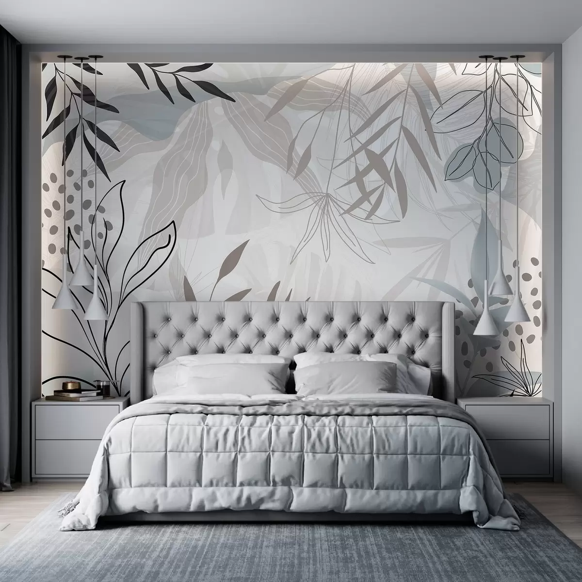 Valokuvatapetti Abstrakti kukka moderni muotoilu pastelli beige, harmaa, sininen ja musta lehdet, herkkä viivataide ja pehmeä tausta Nr w09105