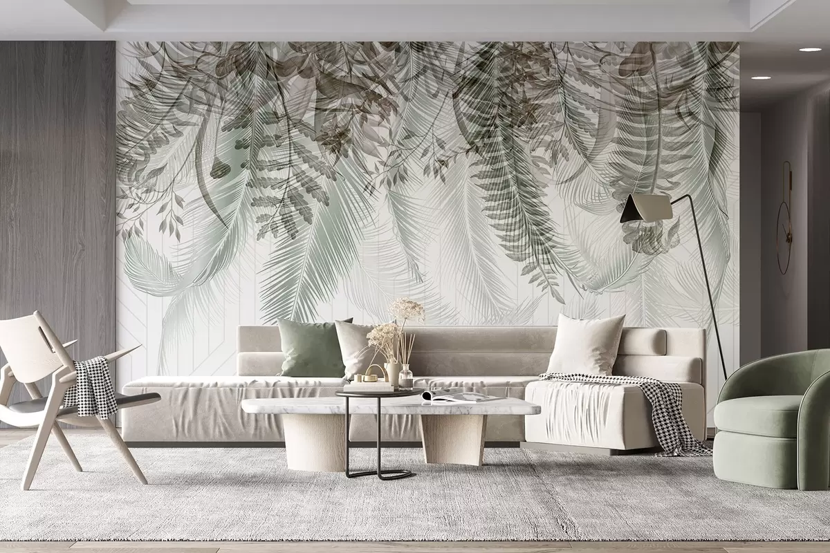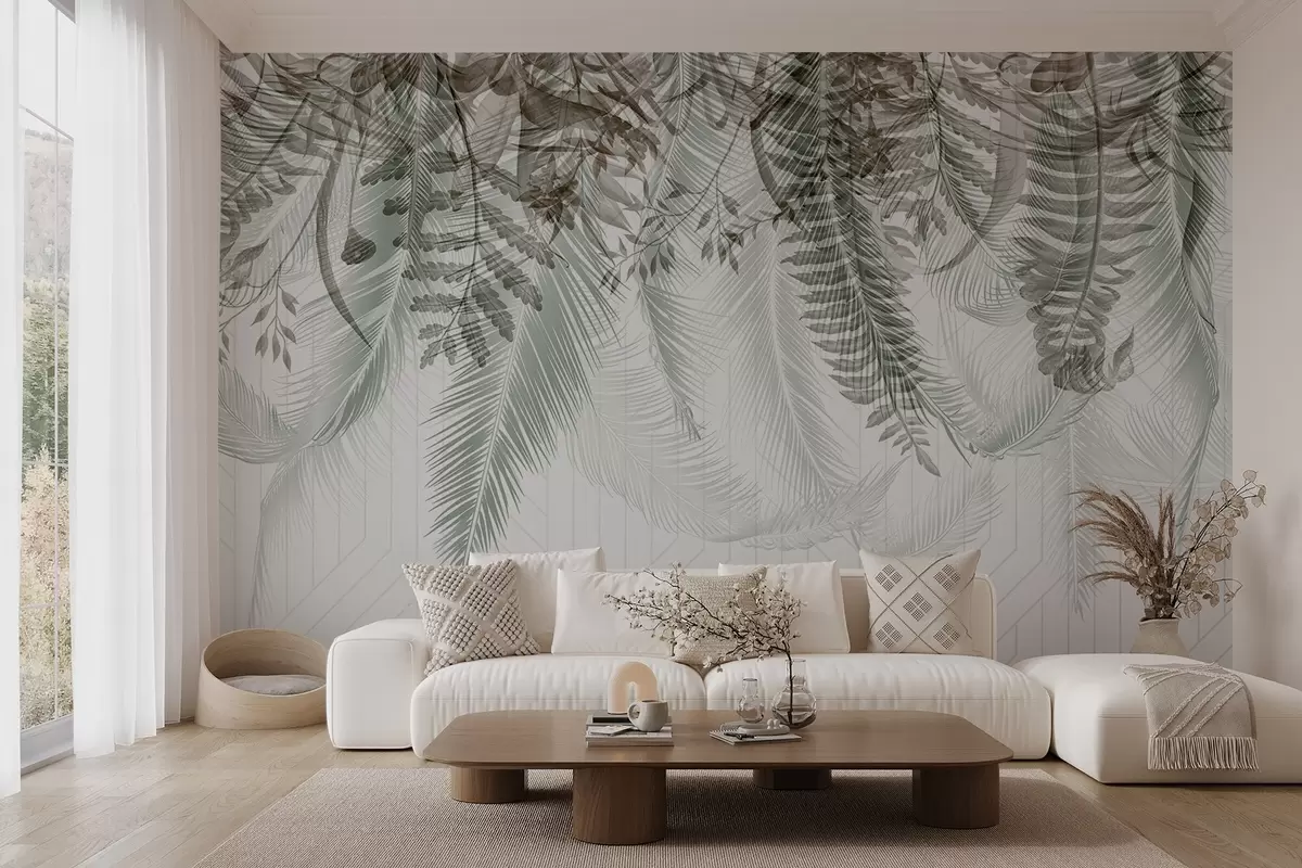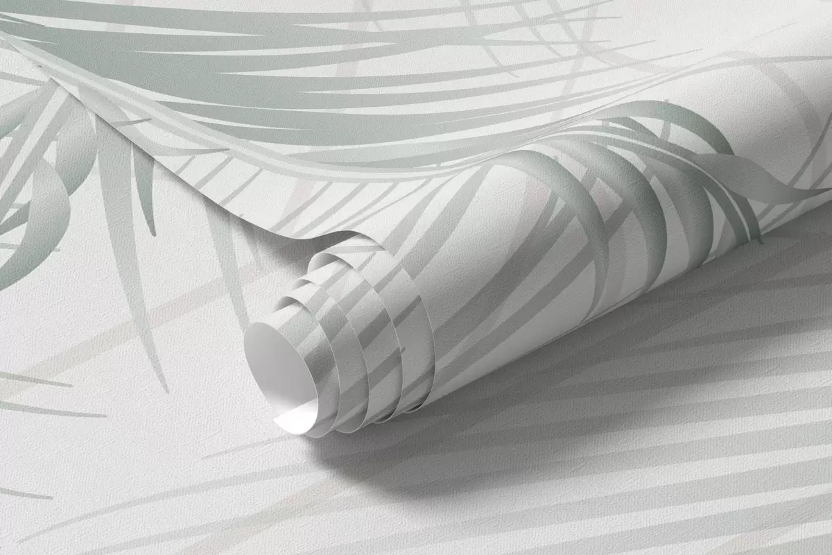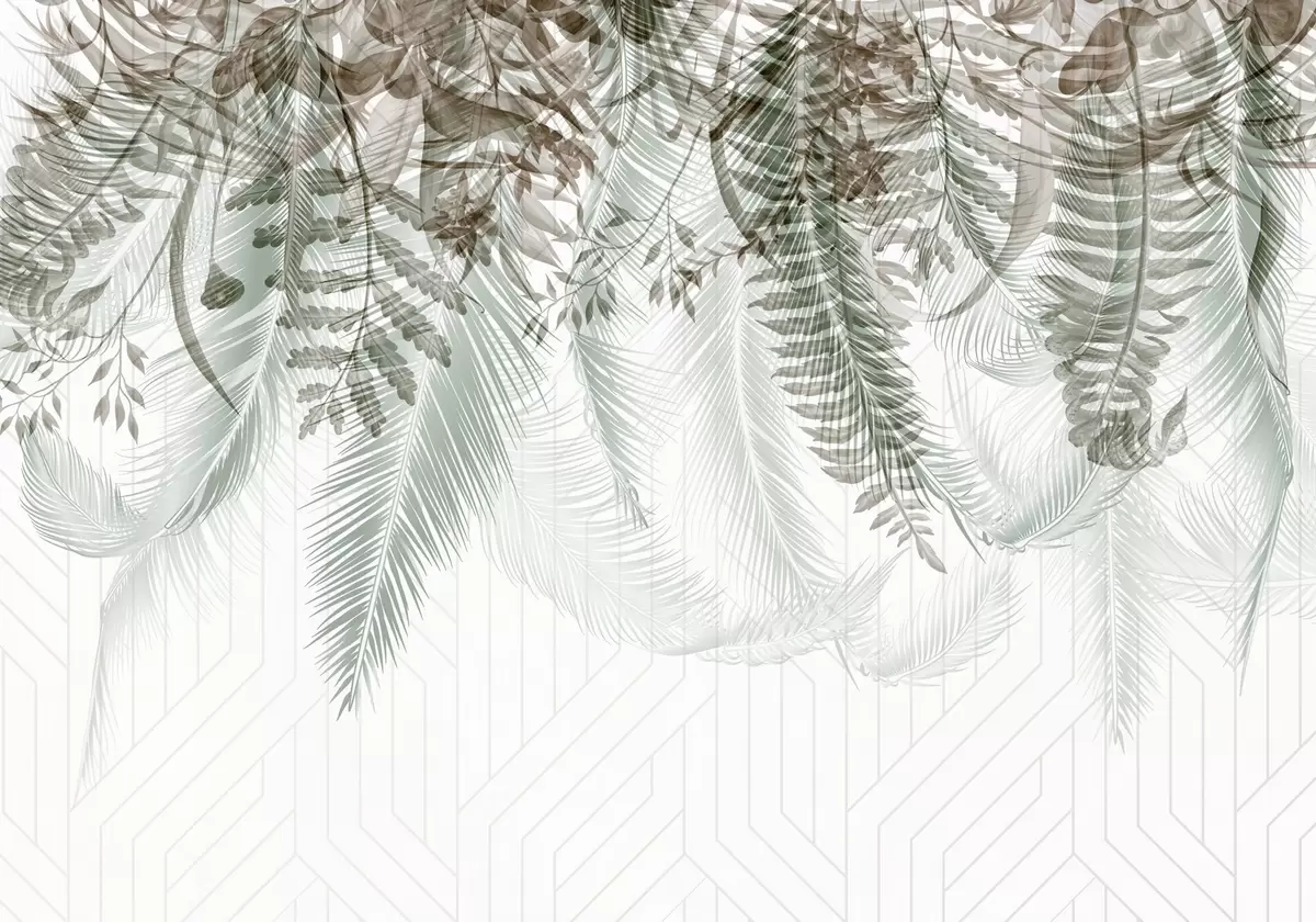 Valokuvatapetti Herkästi putoava trooppinen saniainen ja palmunlehdet, geometrinen tausta, pehmeä valo, hillityt värit, elegantti Nr w09106v1