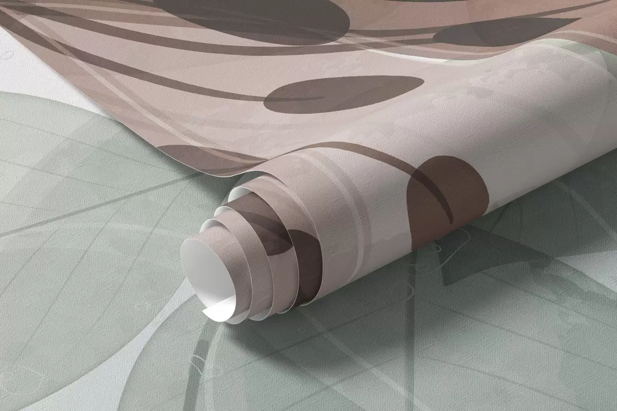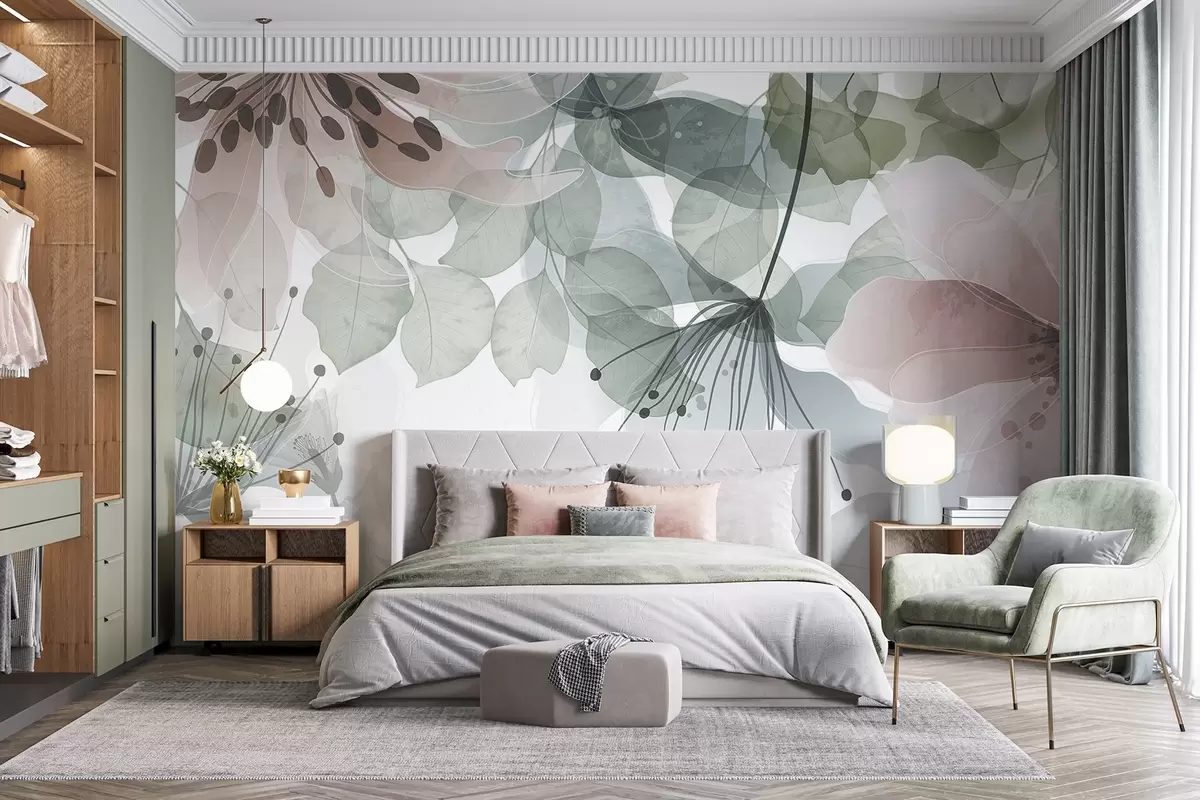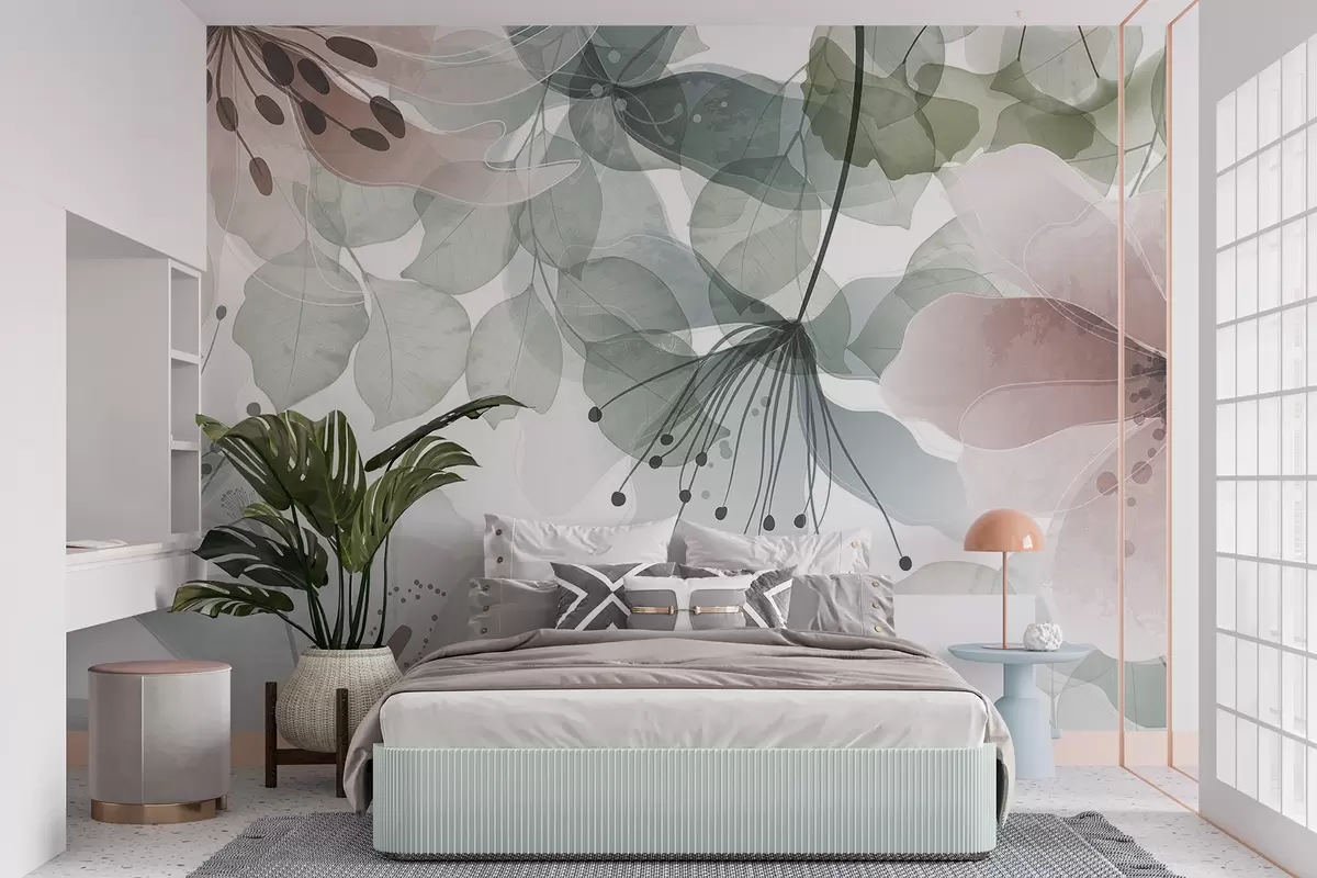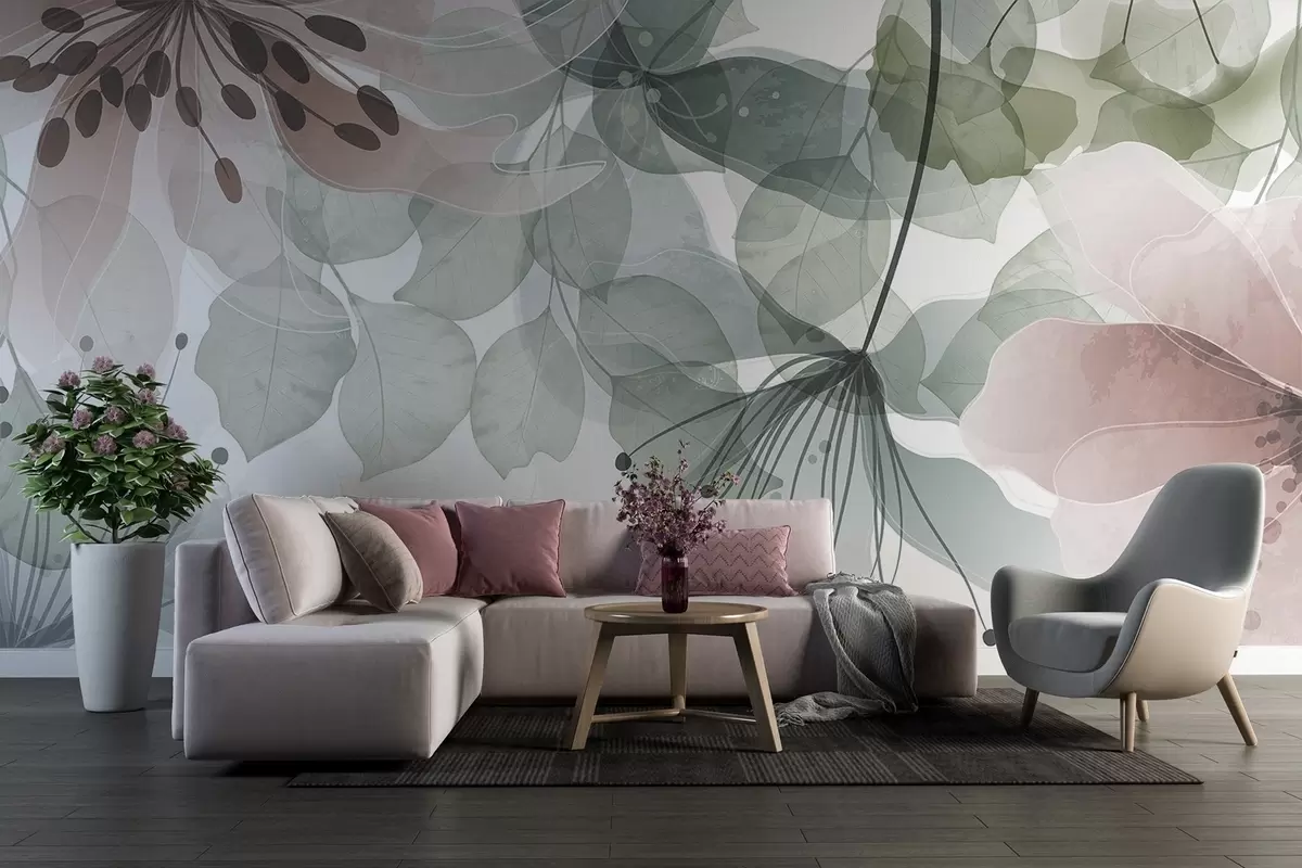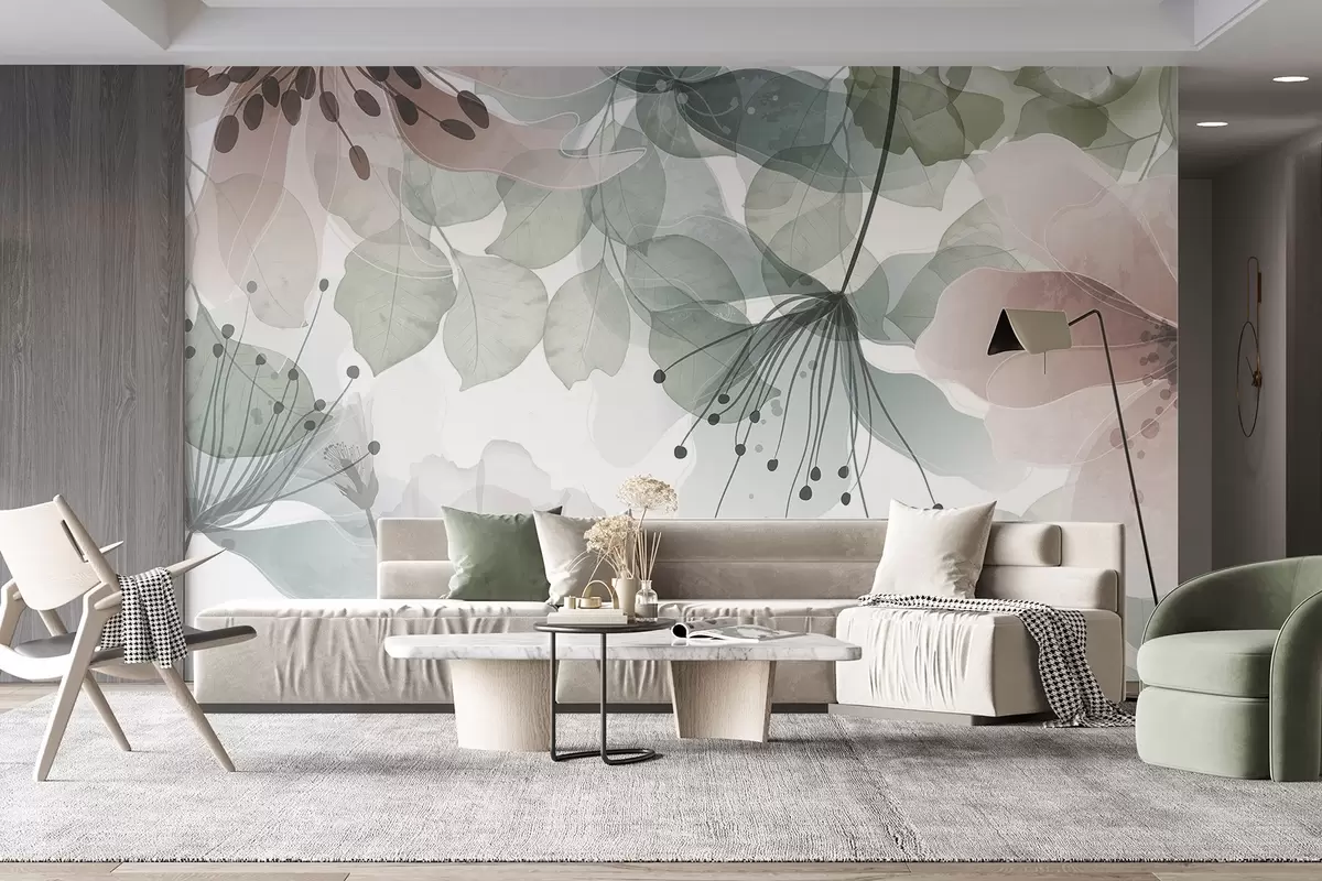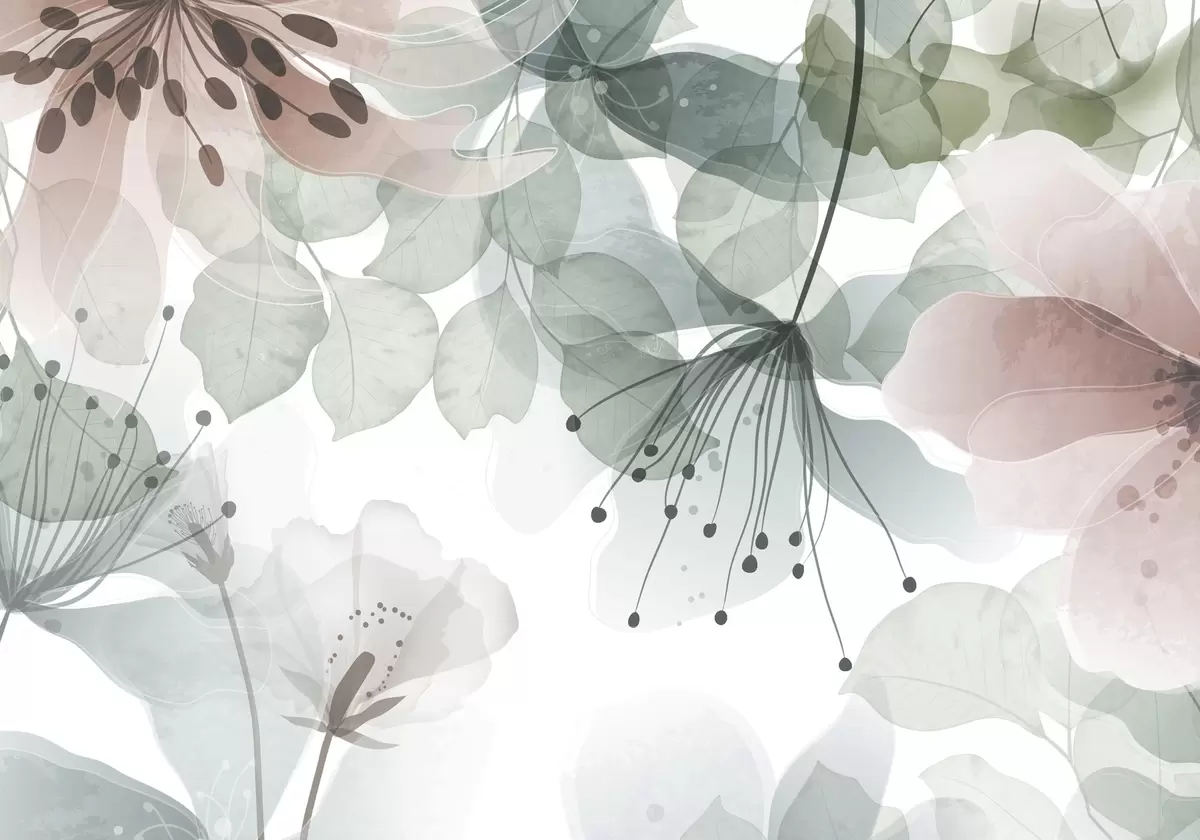 Valokuvatapetti Kukkia ja lehtiä pastellisissa väreissä, läpikuultavat terälehdet ja lehdet, pehmeä akvarellivaikutelma, herkät viivat, valkoinen tausta Nr w09107