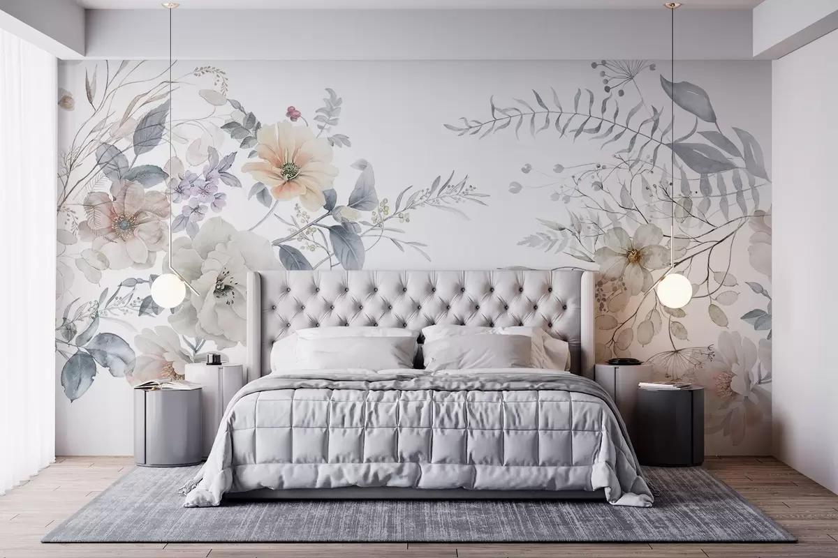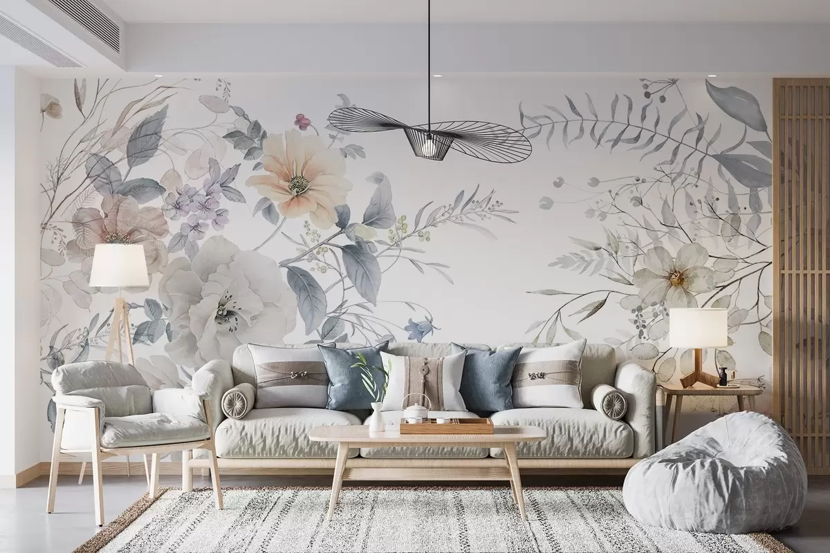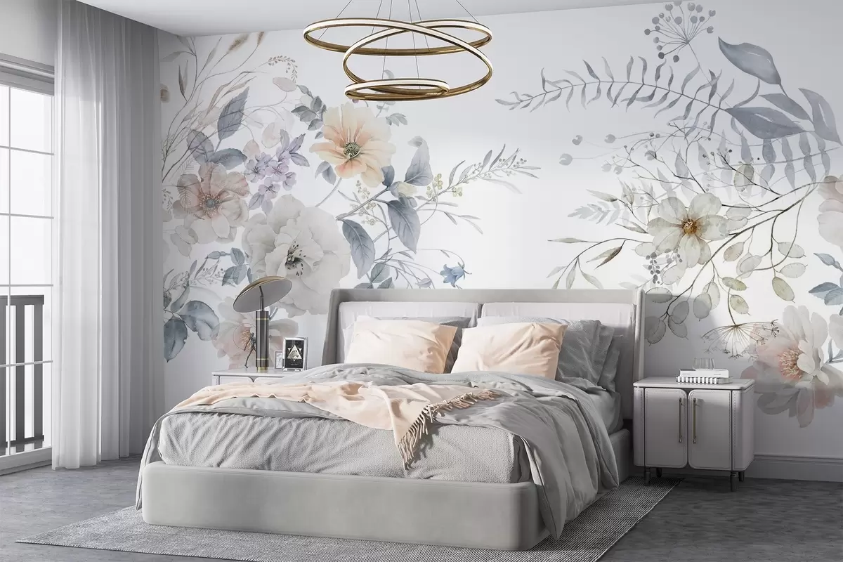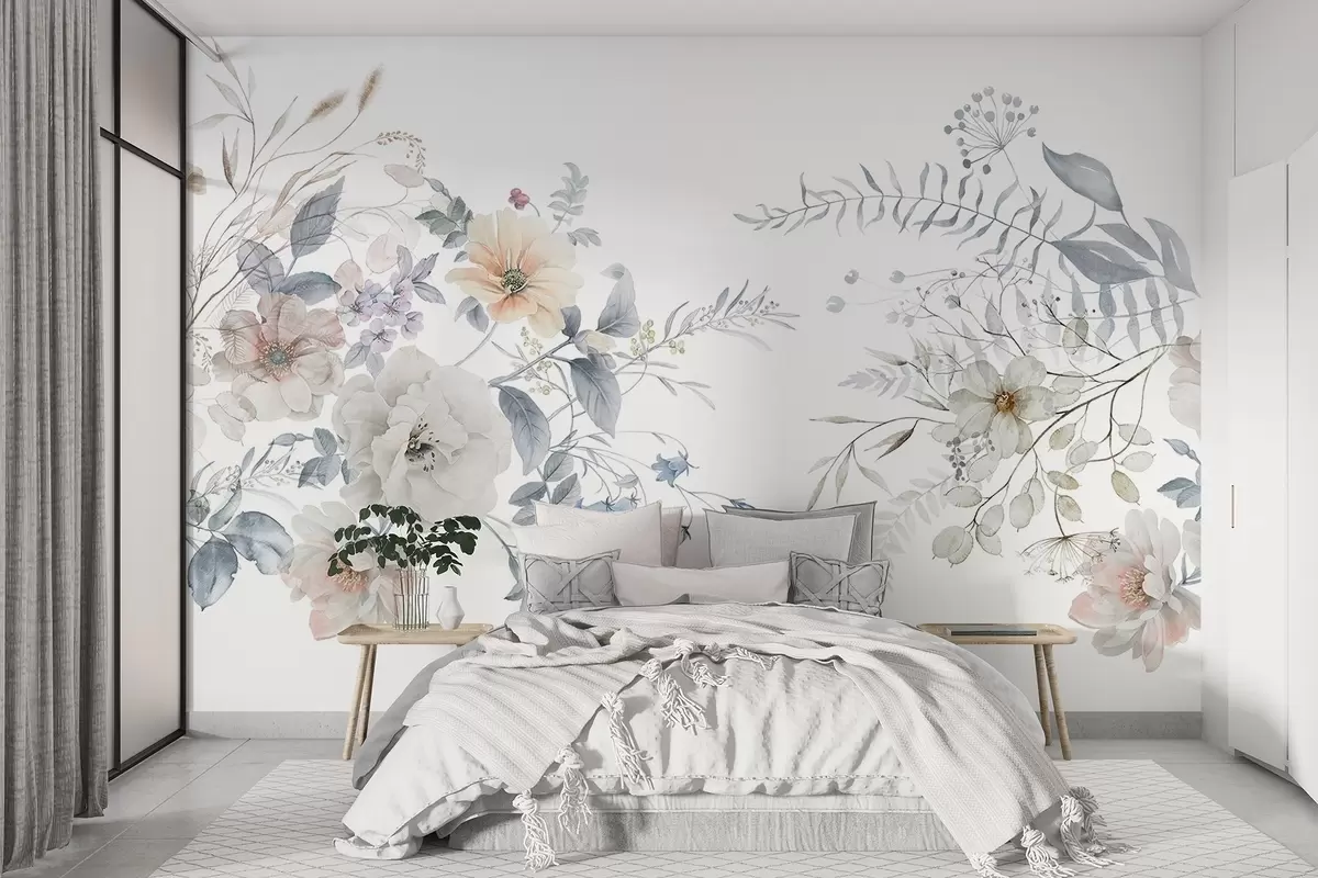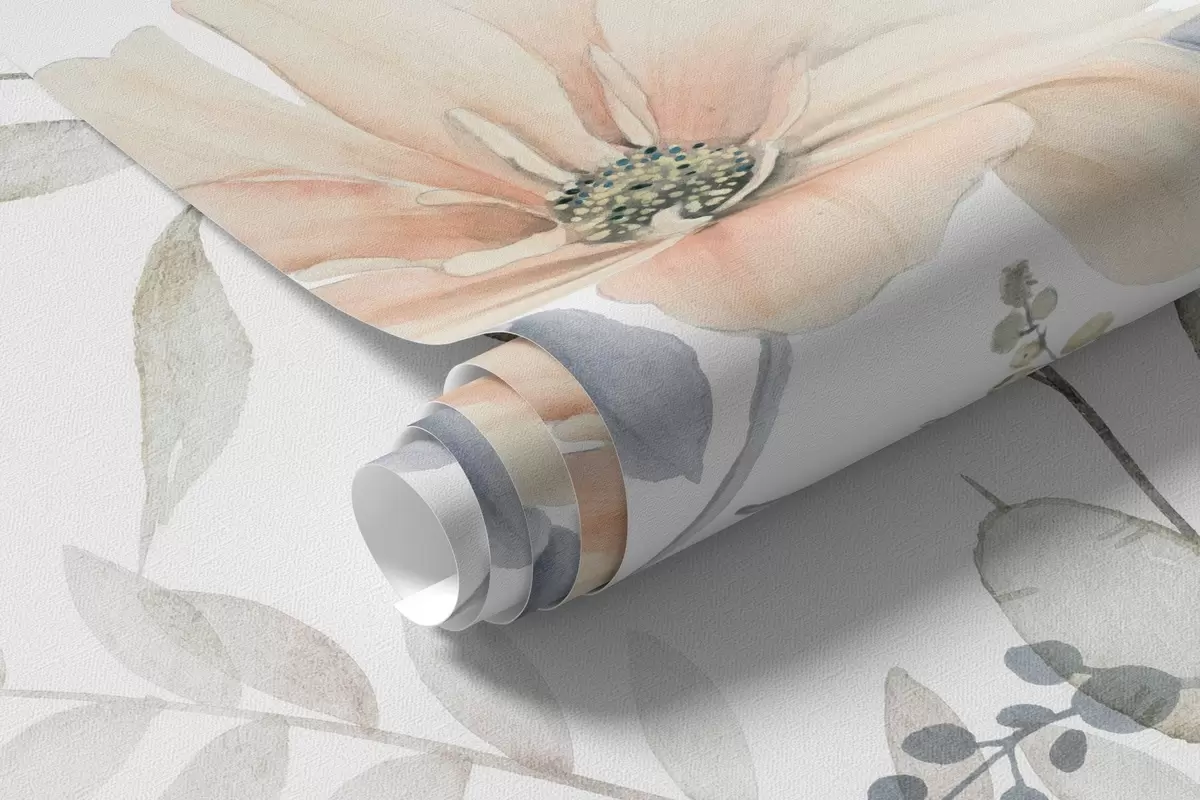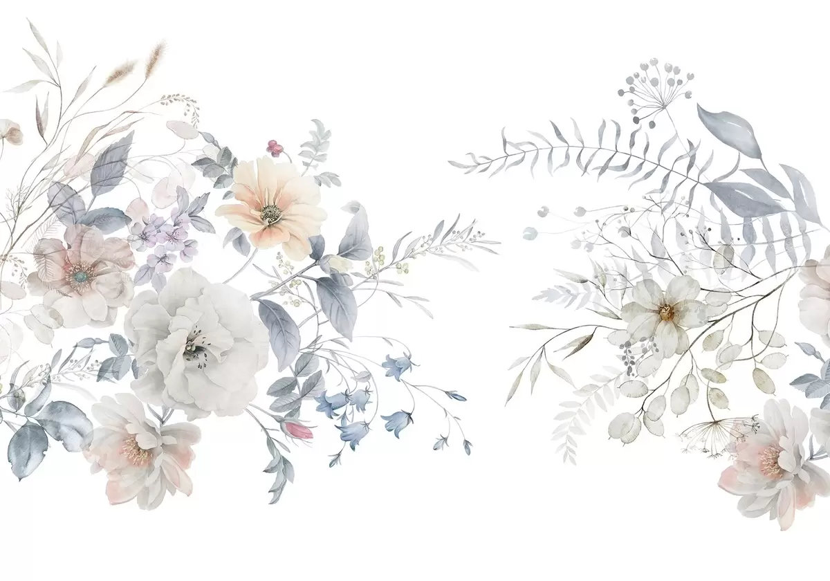 Valokuvatapetti Kukka-asetelma vesivärimaalaustyyliin, jossa on valkoisia, persikkaisia ja sinisiä kukkia, herkkä vehreys valkoisella pohjalla Nr w09108