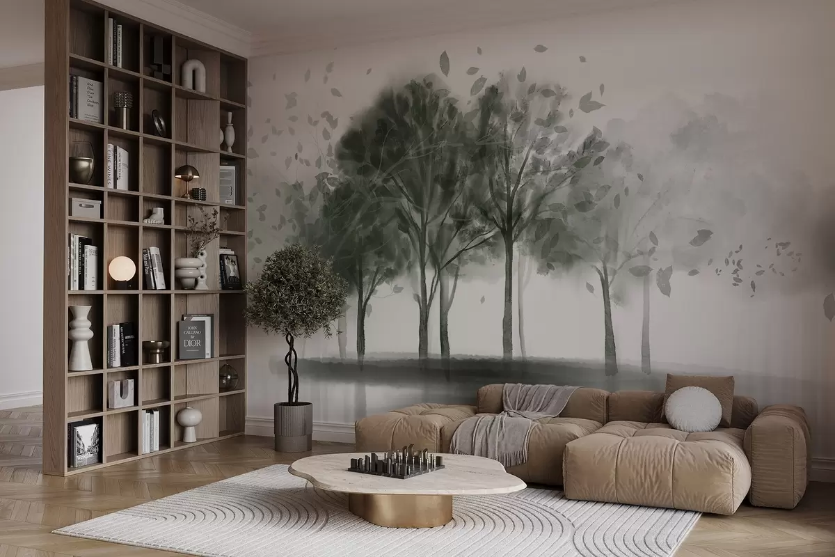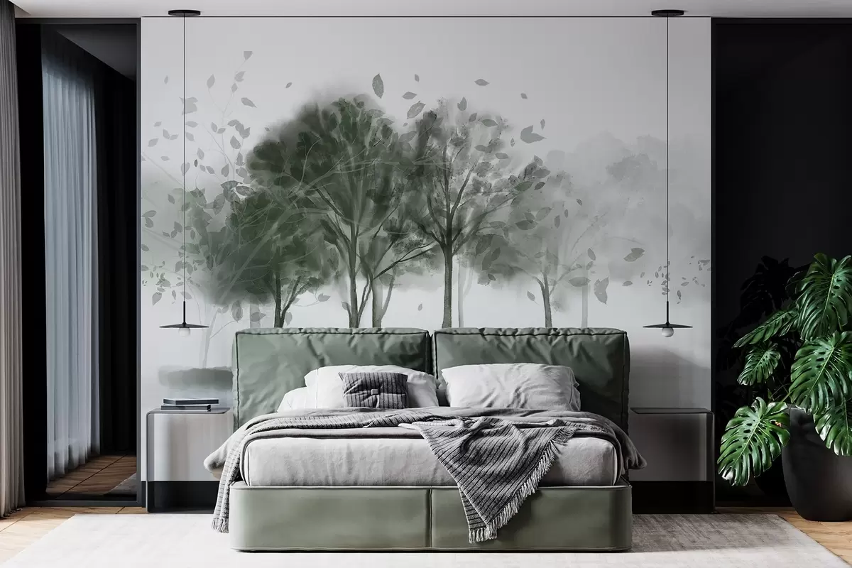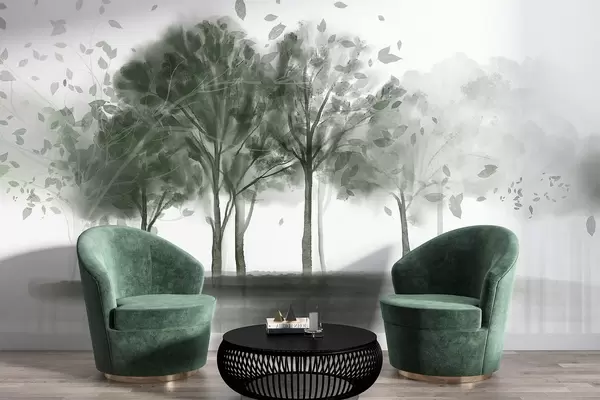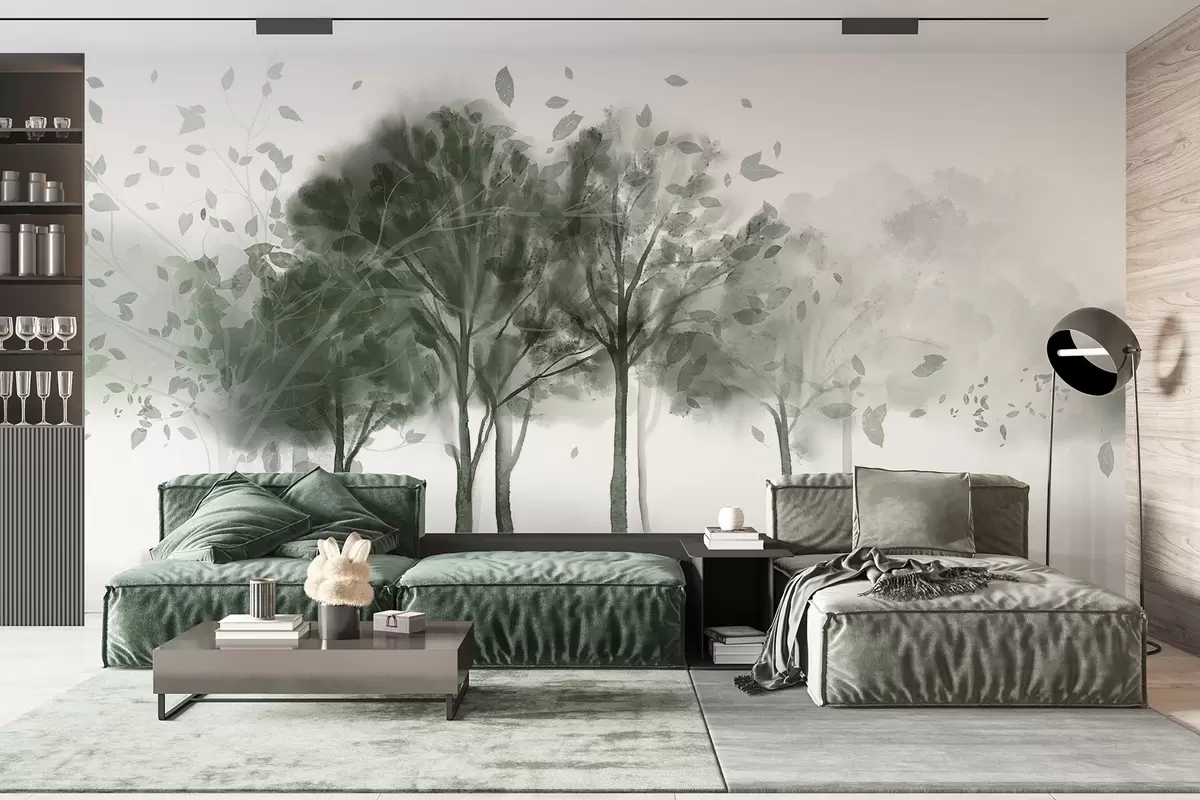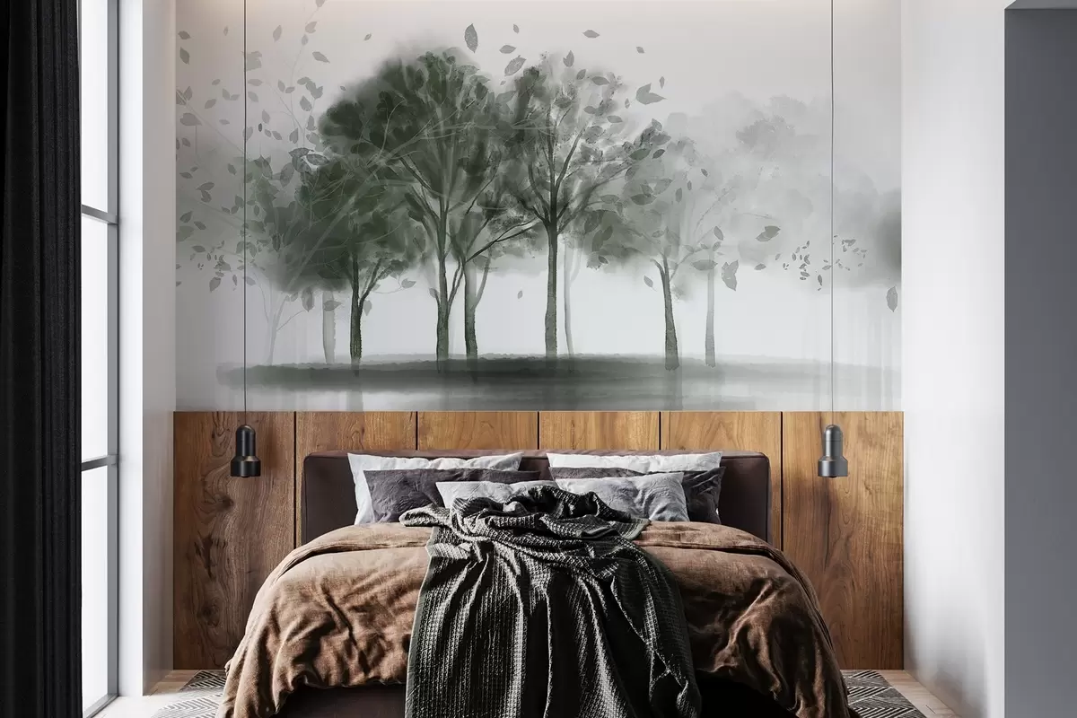 Valokuvatapetti Abstrakti maisema, jossa puut, joissa vihreät lehdet heijastuvat veteen, vesivärillä kuvioitu tyyli Nr w09109