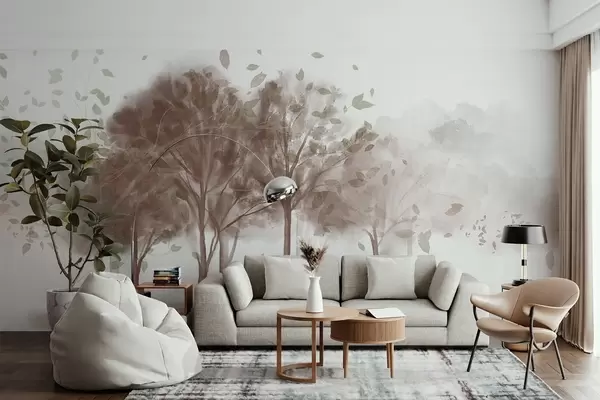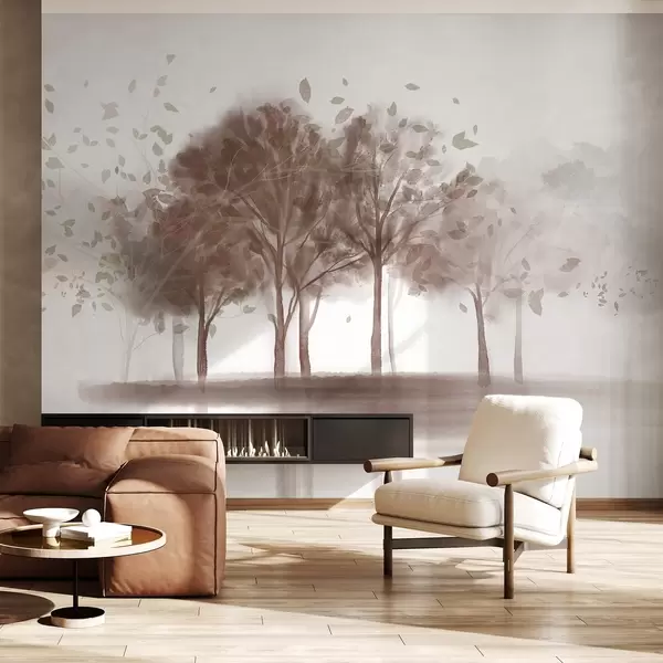 Valokuvatapetti Abstrakti maisema, jossa puut ruskeat lehdet heijastuvat vedessä, akvarelli kuvioitu tyyliä w09109v1