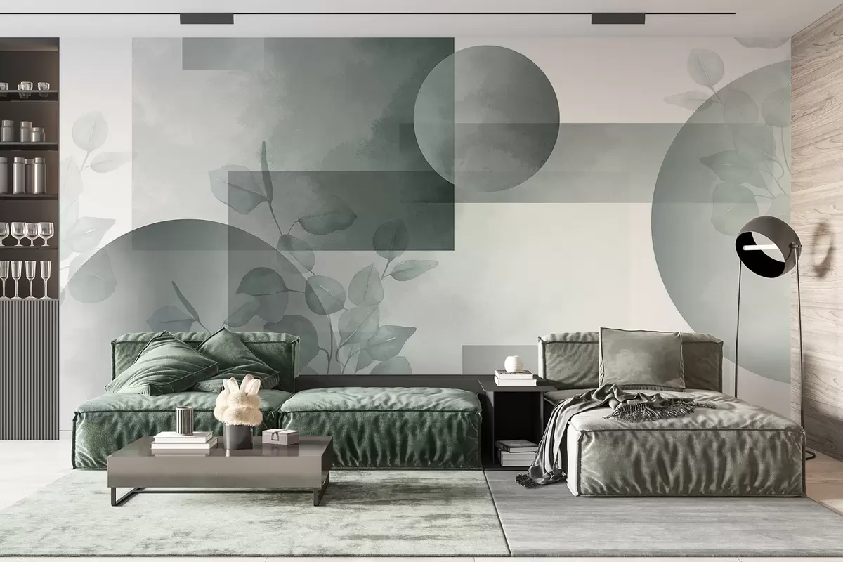 Valokuvatapetti Abstrakti moderni minimalistinen geometrinen muotoilu ympyröillä ja suorakulmioilla, eukalyptuslehdet, vesiväriefekti Nr w09110