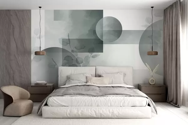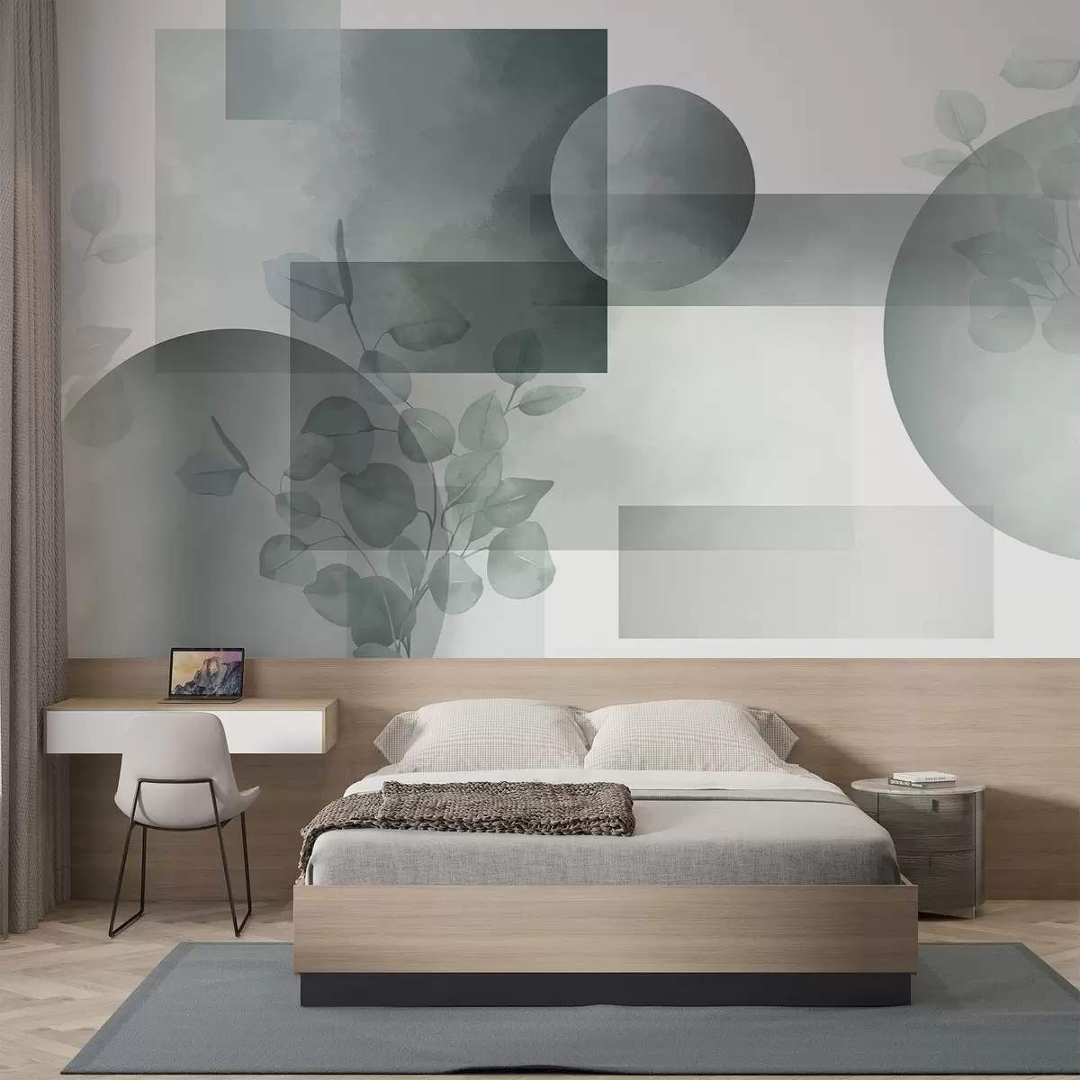 Valokuvatapetti Abstrakti moderni minimalistinen geometrinen muotoilu ympyröillä ja suorakulmioilla, eukalyptuslehdet, vesiväriefekti Nr w09110