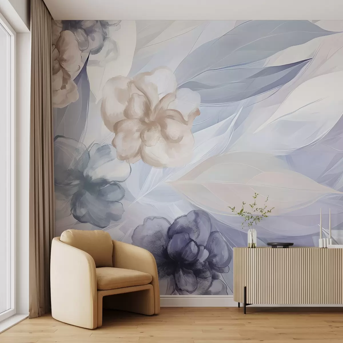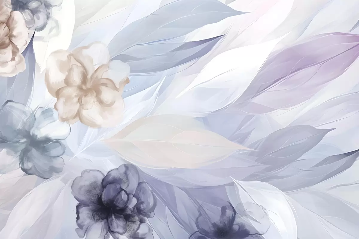 Valokuvatapetti Herkät kukat ja lehdet valkoisen, sinisen, violetin ja beigen sävyissä kukka tausta , pehmeät värit, herkät terälehdet Nr w09111