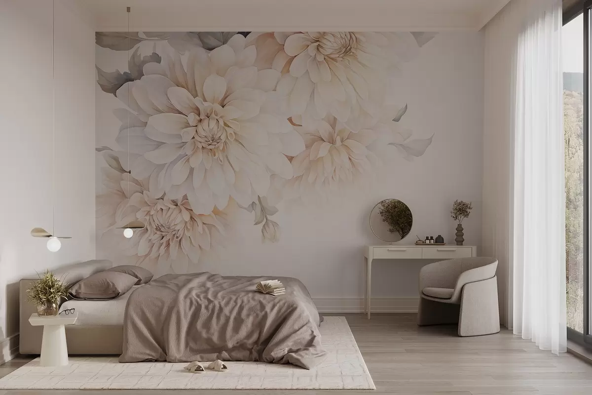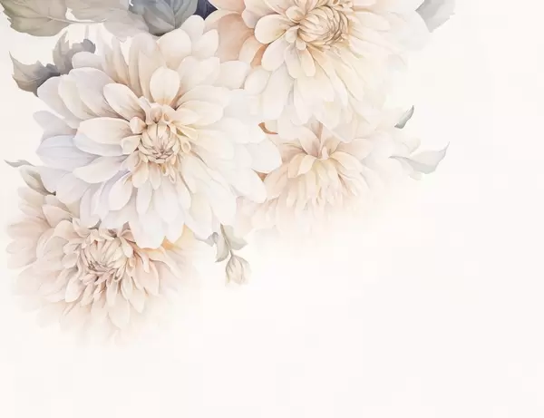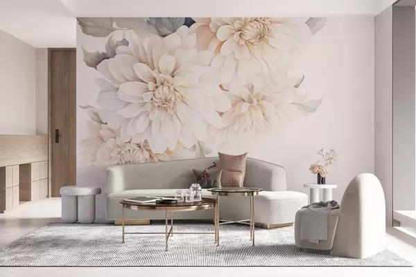 Valokuvatapetti Pastellin väriset daaliat, joissa on pehmeät, herkät persikkaiset ja valkoiset kevyet terälehdet vesivärityyliin, pehmeä tausta Nr w09115