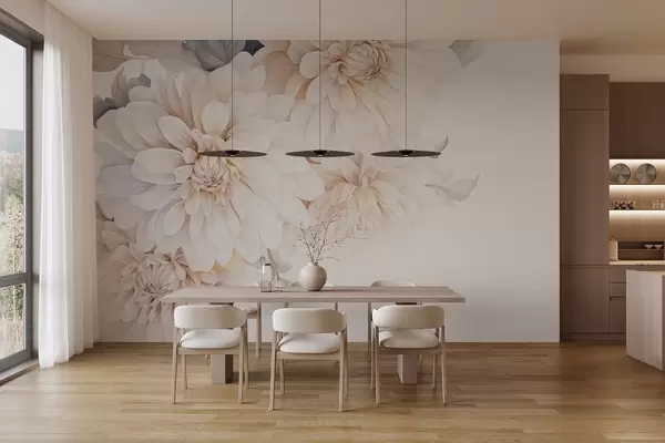 Valokuvatapetti Pastellin väriset daaliat, joissa on pehmeät, herkät persikkaiset ja valkoiset kevyet terälehdet vesivärityyliin, pehmeä tausta Nr w09115