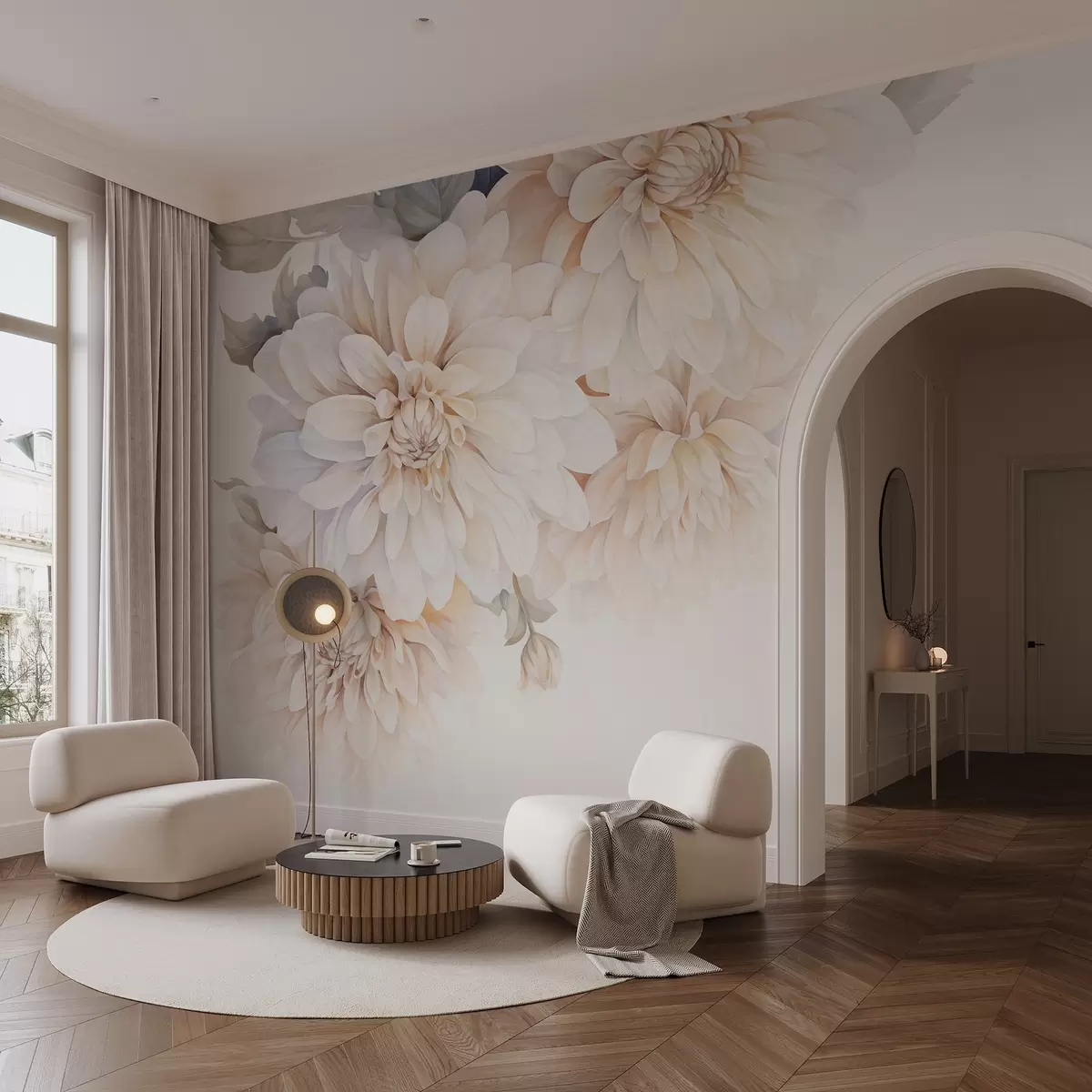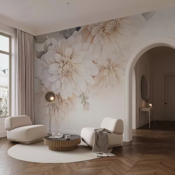 Valokuvatapetti Pastellin väriset daaliat, joissa on pehmeät, herkät persikkaiset ja valkoiset kevyet terälehdet vesivärityyliin, pehmeä tausta Nr w09115