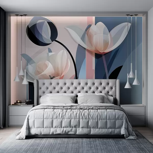 Valokuvatapetti Abstrakti moderni muotoilu tulppaaneilla, joissa on läpinäkyvät terälehdet vaaleanpunaisen, valkoisen ja tummansinisen pastellisävyissä sävyissä Nr w09116