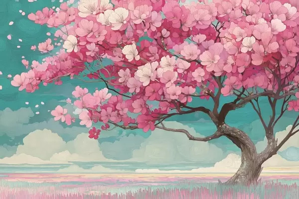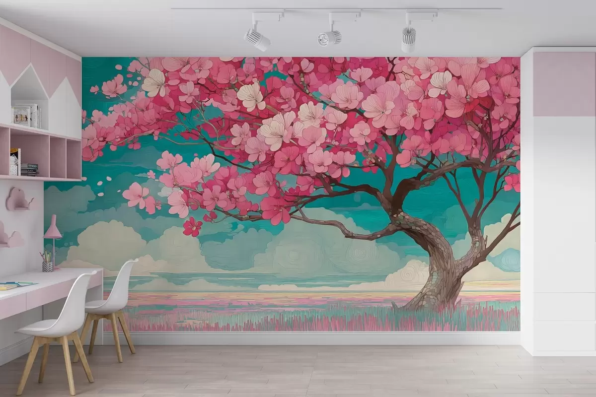 Valokuvatapetti Vaaleanpunainen kirsikankukkapuu, jonka terälehdet putoavat ja sininen taivas romanttiseen tyyliin Nr w09120