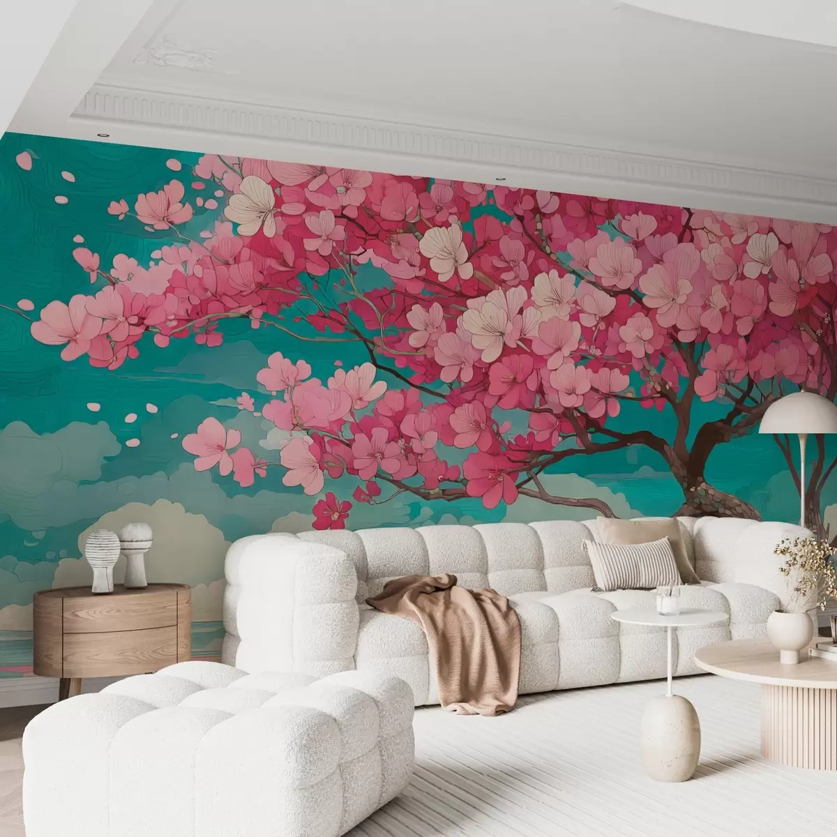Valokuvatapetti Vaaleanpunainen kirsikankukkapuu, jonka terälehdet putoavat ja sininen taivas romanttiseen tyyliin Nr w09120