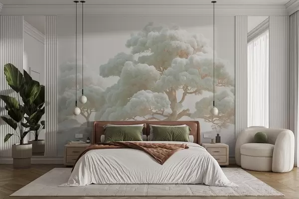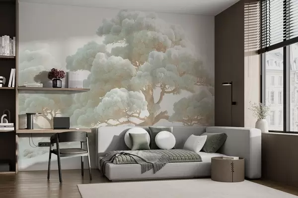 Valokuvatapetti Mäntyjä sumussa pehmeissä sävyissä seisoo metsässä Nr w09122
