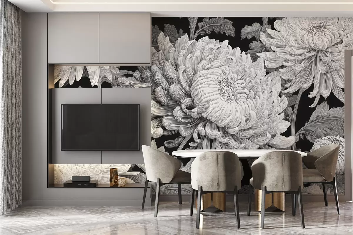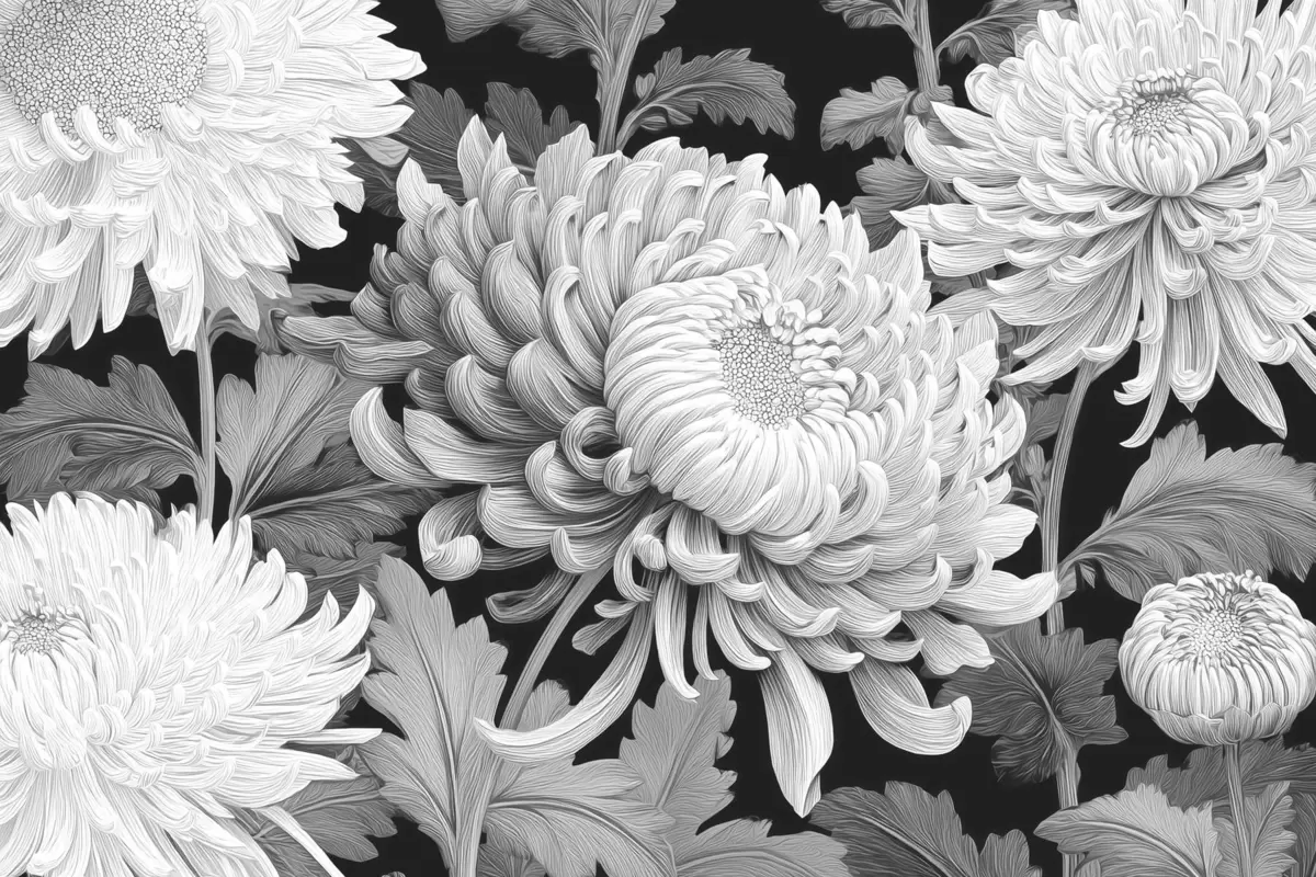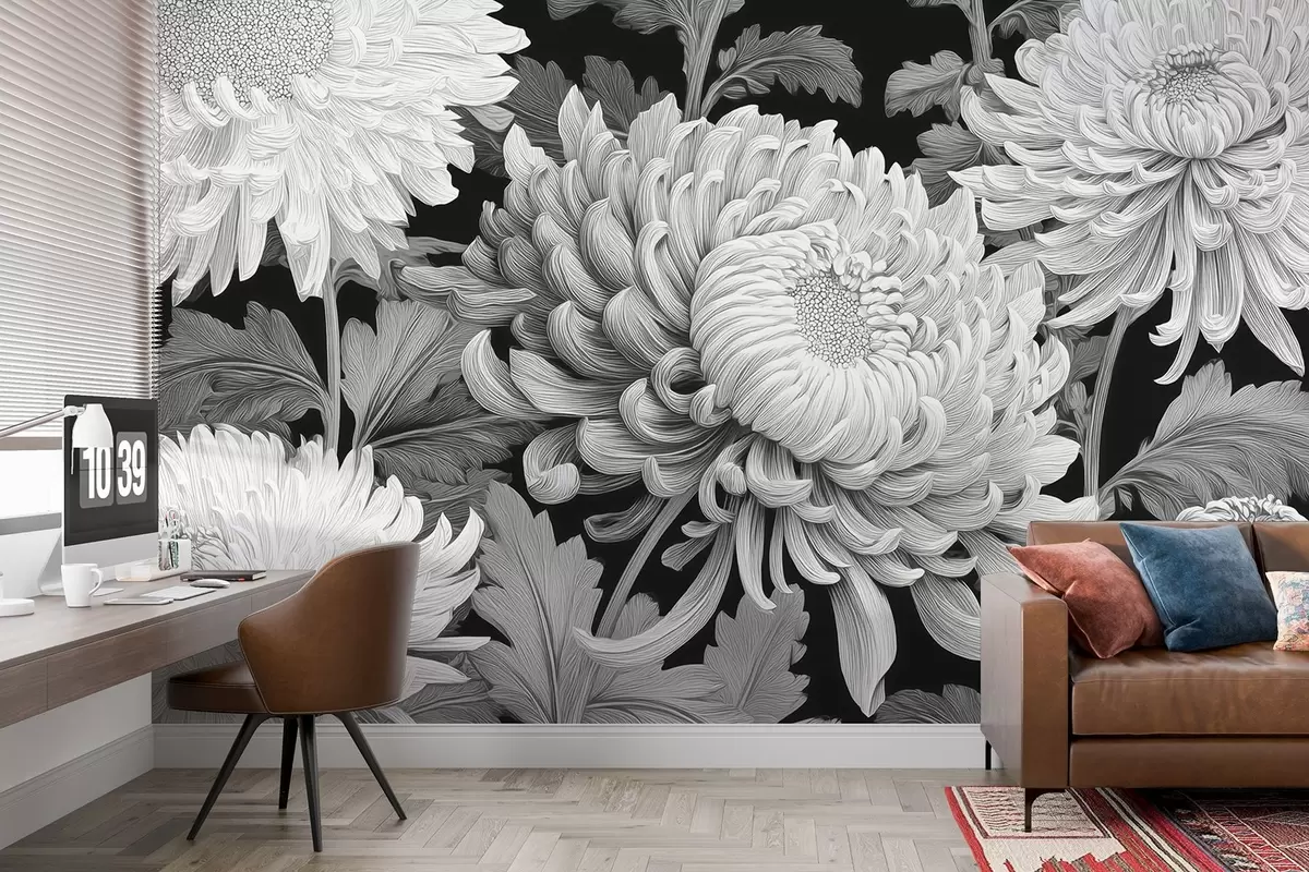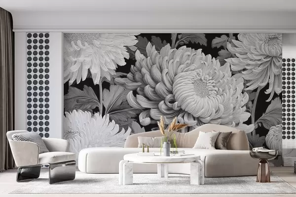 Valokuvatapetti Mustavalkoiset suuret orkideat lehtien kanssa Nr w09125v1