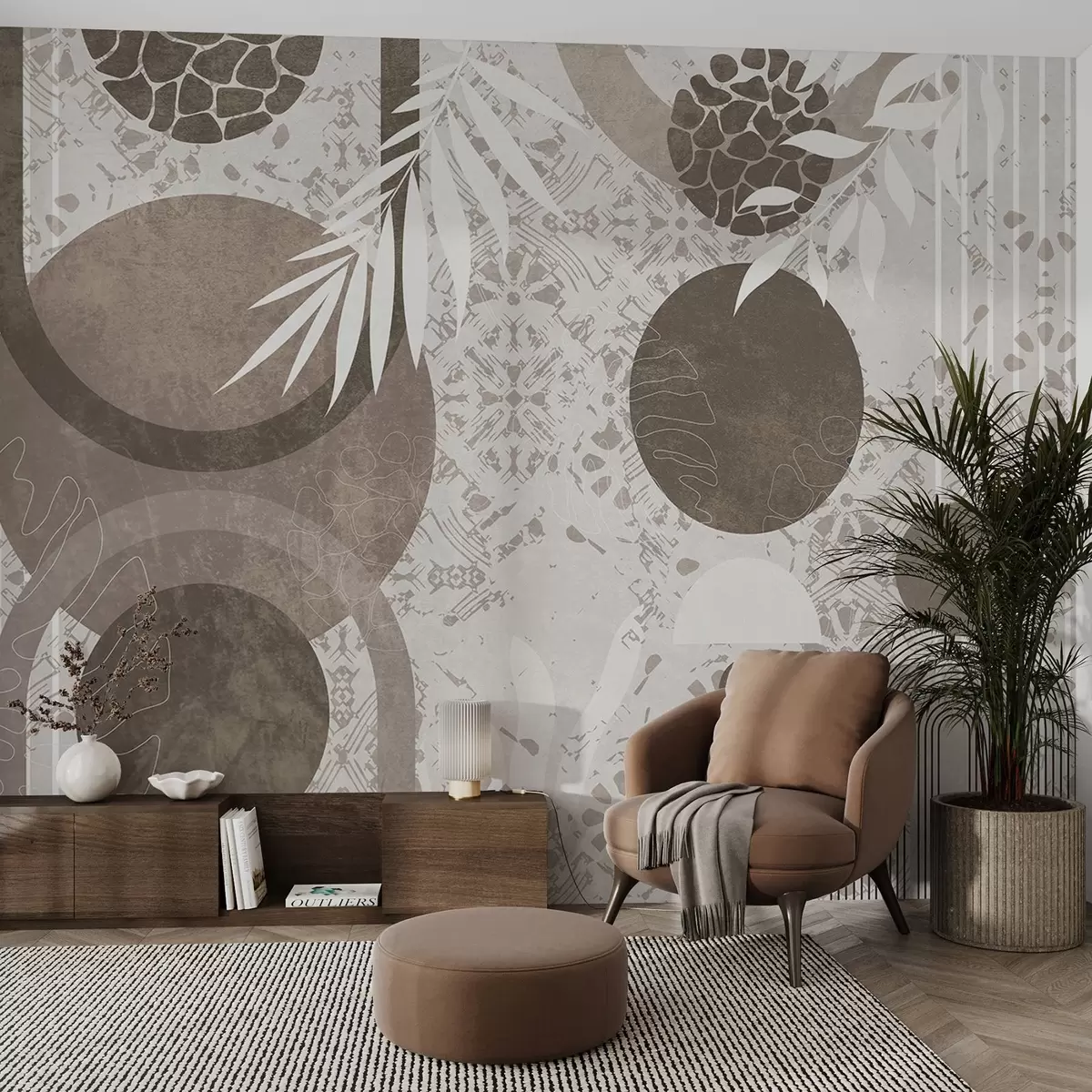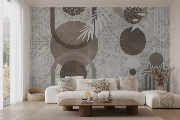 Valokuvatapetti Abstrakteja geometrisia muotoja ruskealla ja valkoisella, ympyröitä, kaaria ja kasvitieteellisiä elementtejä, moderni ja minimalistinen muotoilu Nr w09130