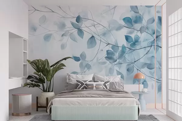 Valokuvatapetti Tekstuurinen akvarellimaalaus jäljitelmä sinisiä lehtiä ja oksia, pehmeät värit, herkät yksityiskohdat valkoista taustaa vasten Nr w09133v1