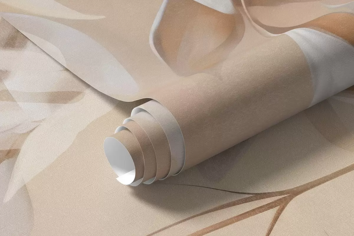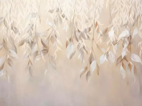 Valokuvatapetti Ripustettavat kuvioidut valkoiset ja beigen väriset lehdet pehmeällä väripaletilla, persikka, harmaa ja valkoinen herkkä tausta Nr w09136
