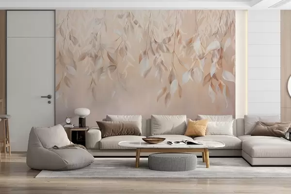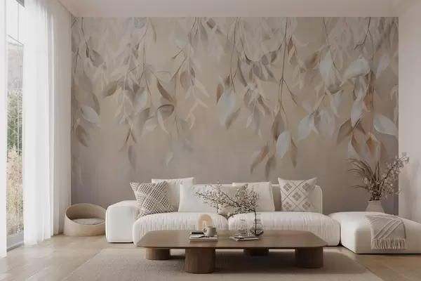 Valokuvatapetti Ripustettavat kuvioidut valkoiset ja beigen väriset lehdet pehmeällä väripaletilla, persikka, harmaa ja valkoinen herkkä tausta Nr w09136
