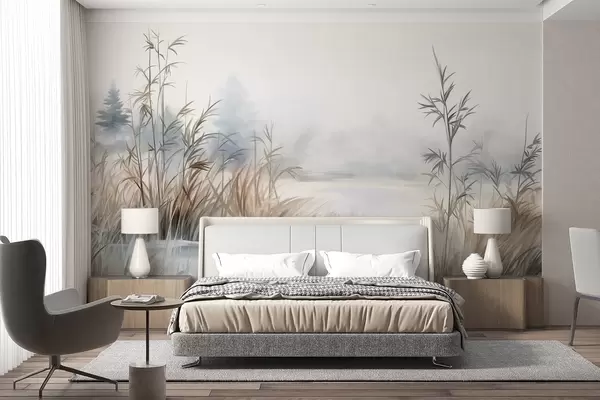 Valokuvatapetti Teksturoitu maisema järvellä, jossa korkeat ruohot etualalla, pehmeä sininen ja ruskea, rauhallinen vesi, puut kaukana Nr w09137