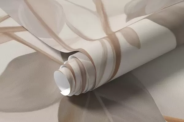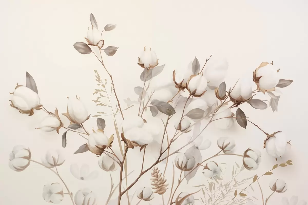 Valokuvatapetti Puuvillakukkia varret ja lehdet vaaleanruskea väripaletti, beige tausta, pehmeä ja herkkä, vesivärityyliin Nr w09141