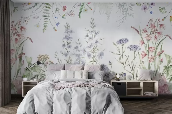 Valokuvatapetti Kukkainen tekstuurinen järjestely värikkäitä kukkia ja vihreitä lehtiä, kasvitieteellinen kuvitus , pehmeät pastellivärit, vintage-tyyliin Nr w09143