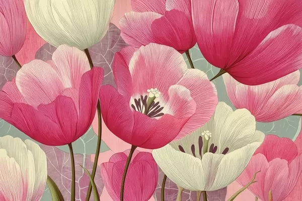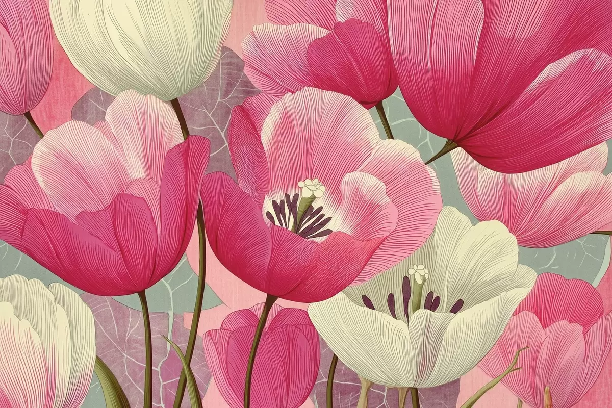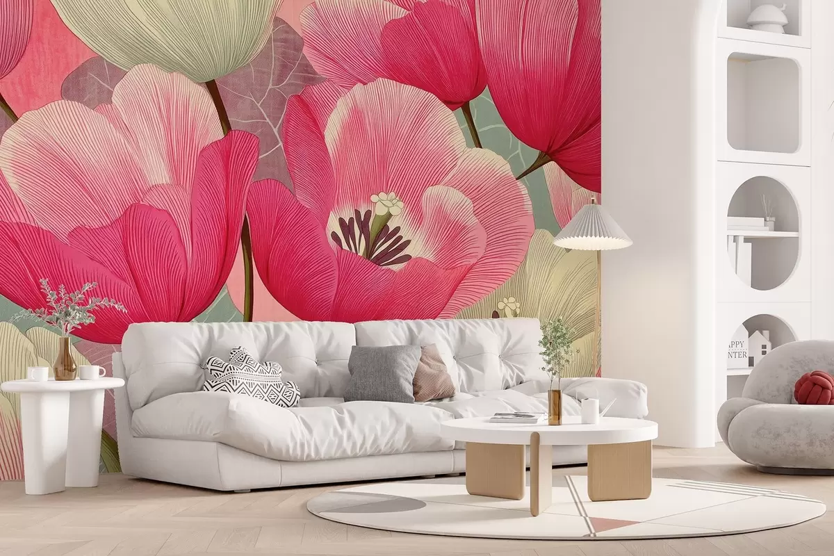 Valokuvatapetti Elävä unikot ja graafinen lehdet taustalla Nr w09152