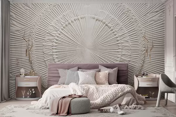Valokuvatapetti Abstrakti kuvioitu pyöreä painatus, jossa on säteittäisiä viivoja ja koriste-elementtejä, symmetrinen muotoilu, kohokuvioitu rakenne Nr w09154