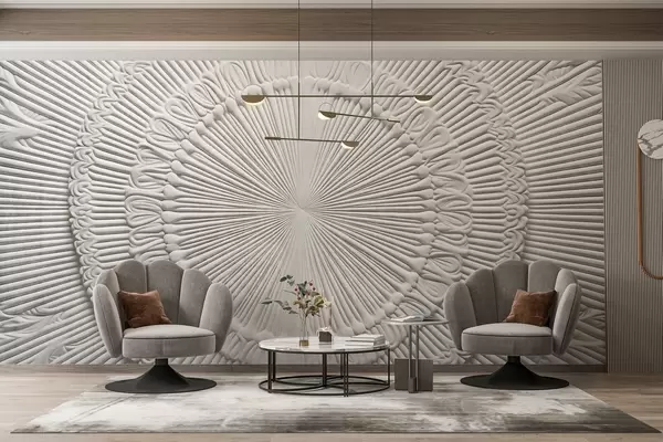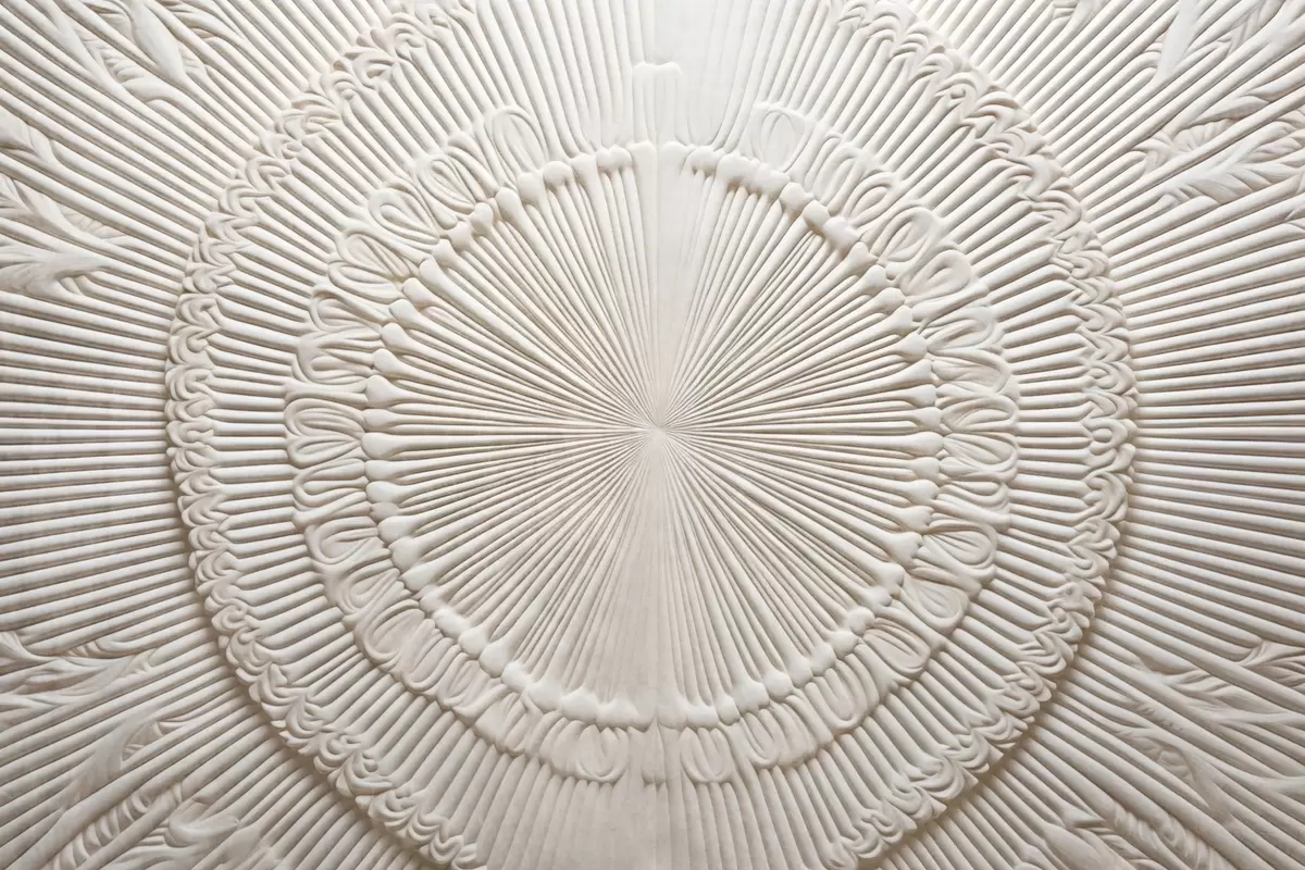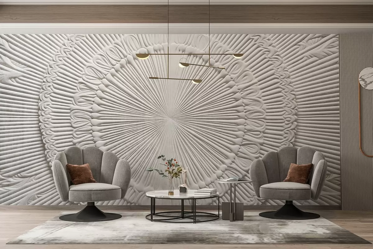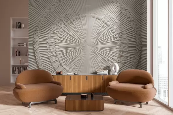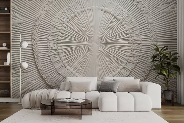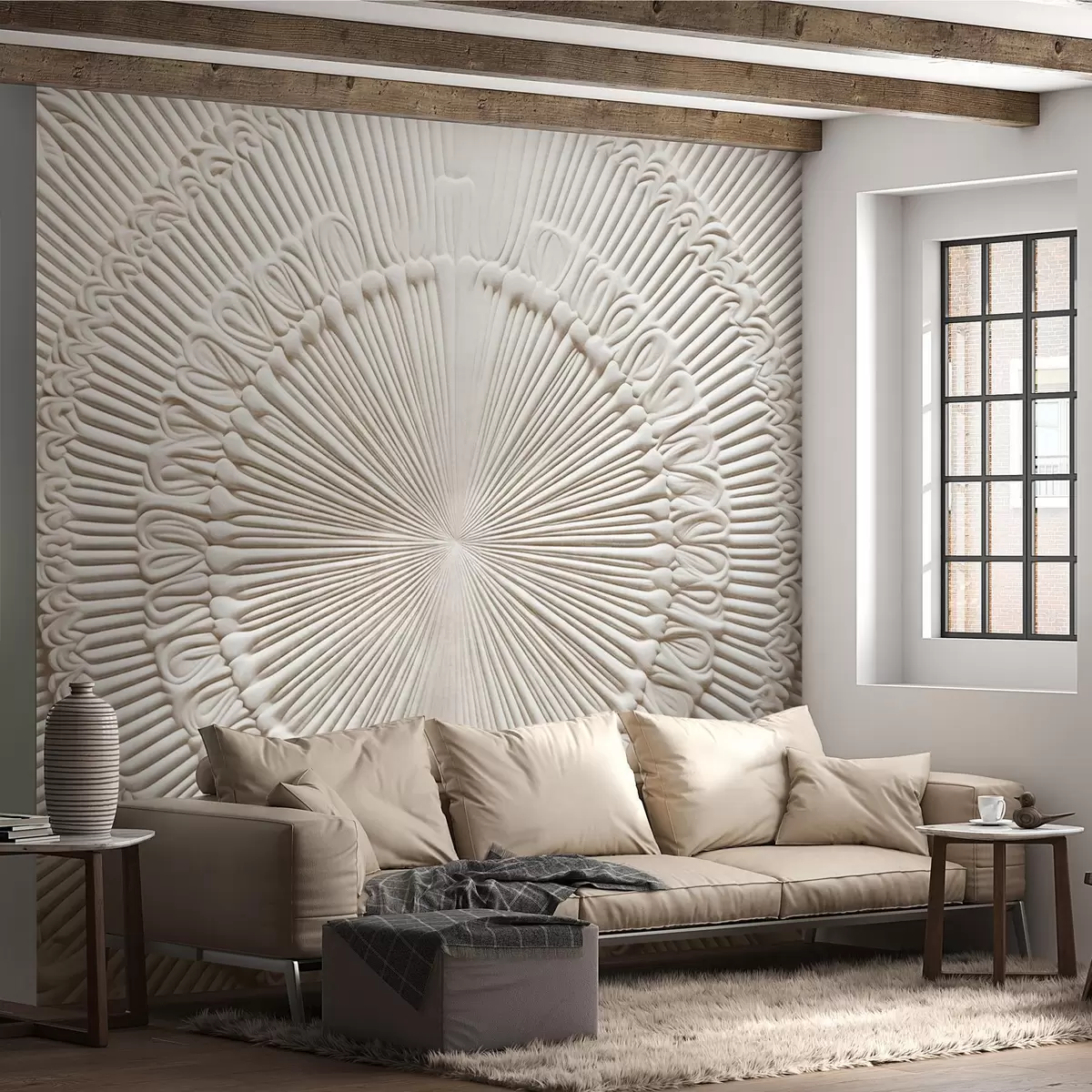 Valokuvatapetti Abstrakti kuvioitu pyöreä painatus, jossa on säteittäisiä viivoja ja koriste-elementtejä, symmetrinen muotoilu, kohokuvioitu rakenne Nr w09154